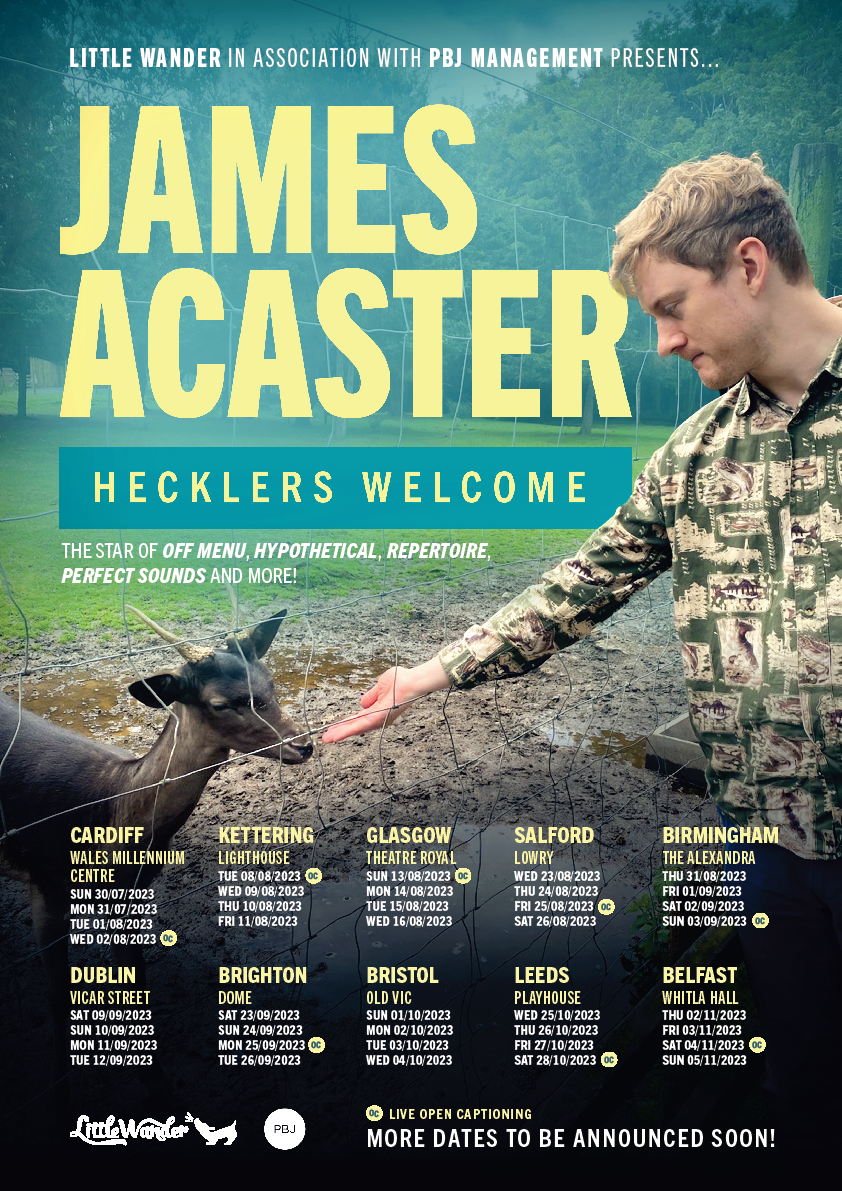 Comedy promoters Little Wander and PBJ Management have announced a new stand-up tour for celebrated comic, James Acaster, with his new, experimental show, Hecklers Welcome.