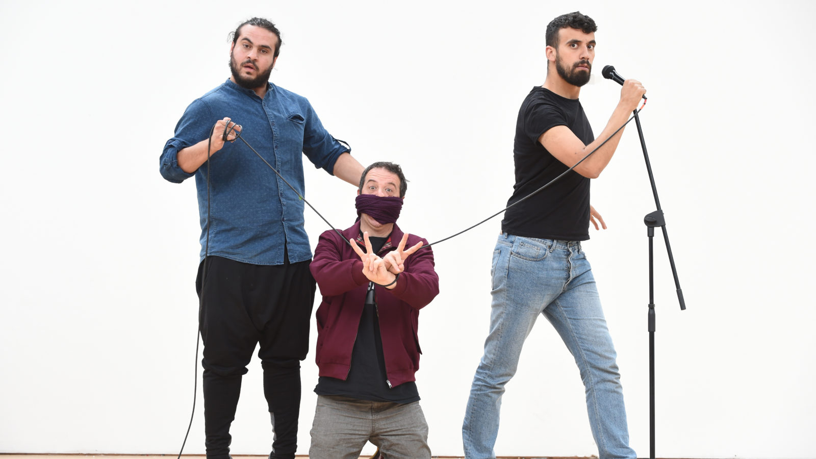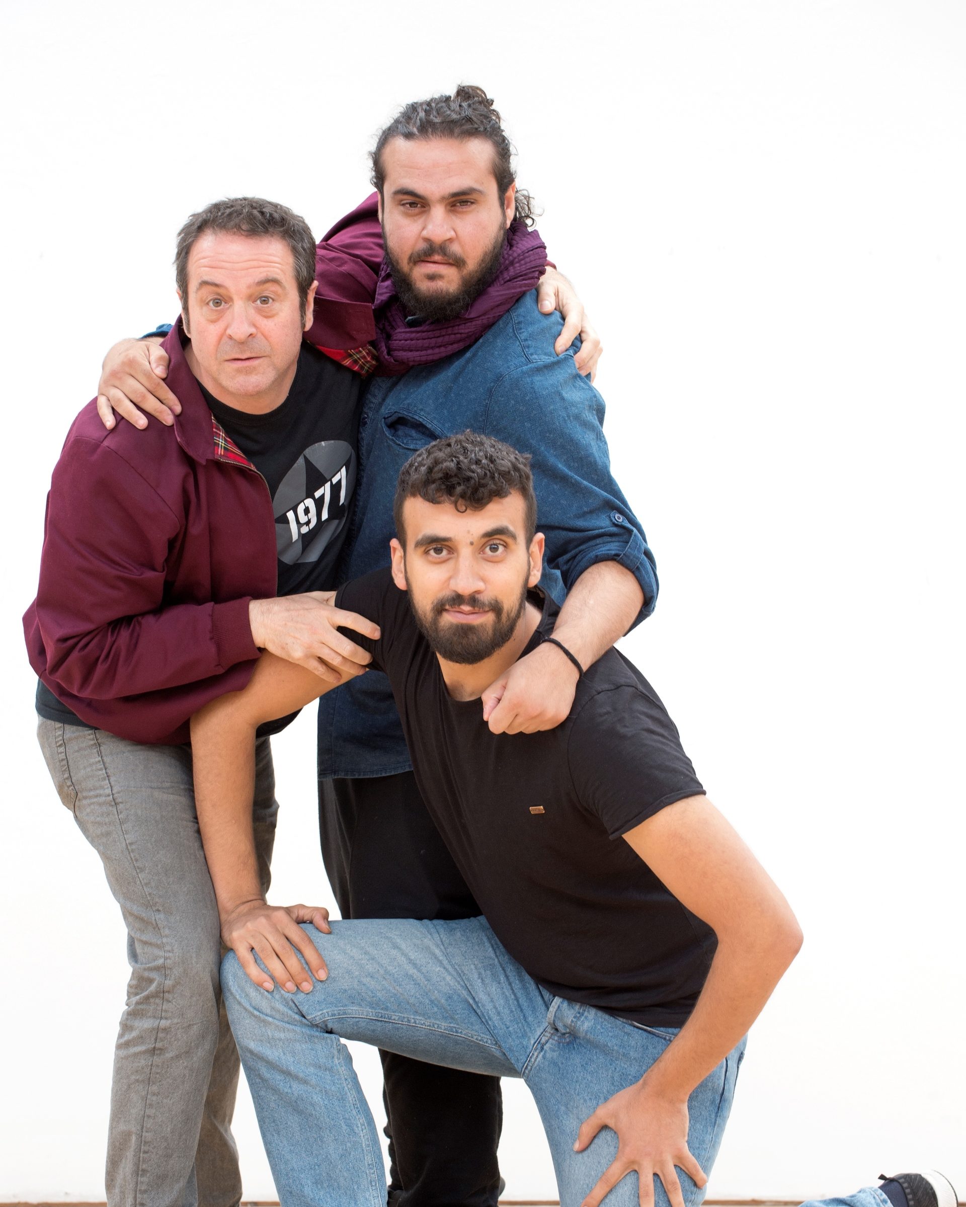 Clockwise from left: Mark Thomas with performers Alaa Shehada and Faisal Abu Alhayjaa. Pics: Lesley Martin