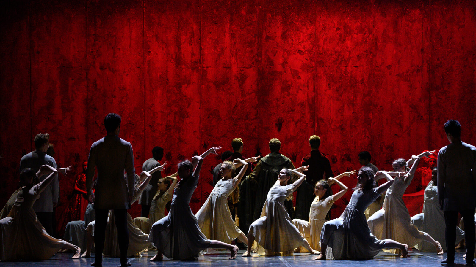 The set and costume design by the Hong Kong-born designer Tim Yip rises to the scale of Khan’s choreography. An imposing stone wall acts as a class barrier between Albrecht and Giselle and it is used cleverly and hauntingly for dramatic effect throughout. As the curtain opens in act one, we see a crowd of bodies pushing against it, desperately trying to make it budge. As they step away, handprints are left behind on its surface.