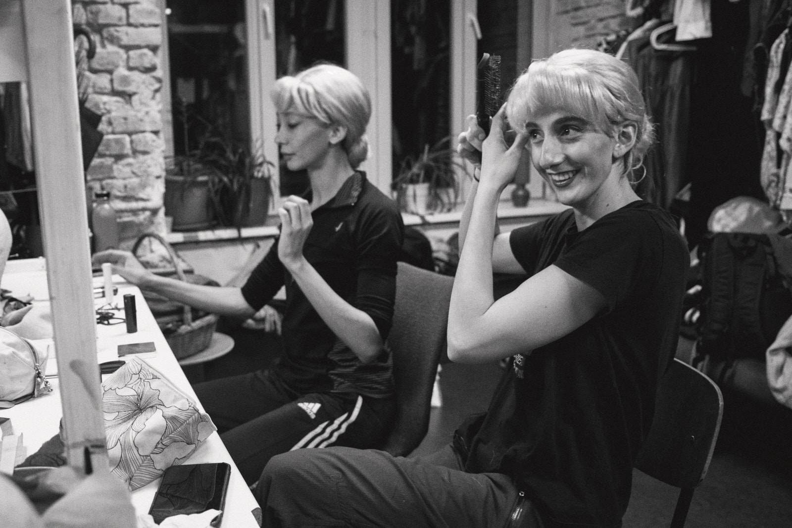 Both performers’ long legs accentuate the artificiality of idealised attractiveness. Recordings of string voice boxes implore “let’s have a costume party” while they mouth increasingly desperate affirmations that they “’love being a fashion model”.
