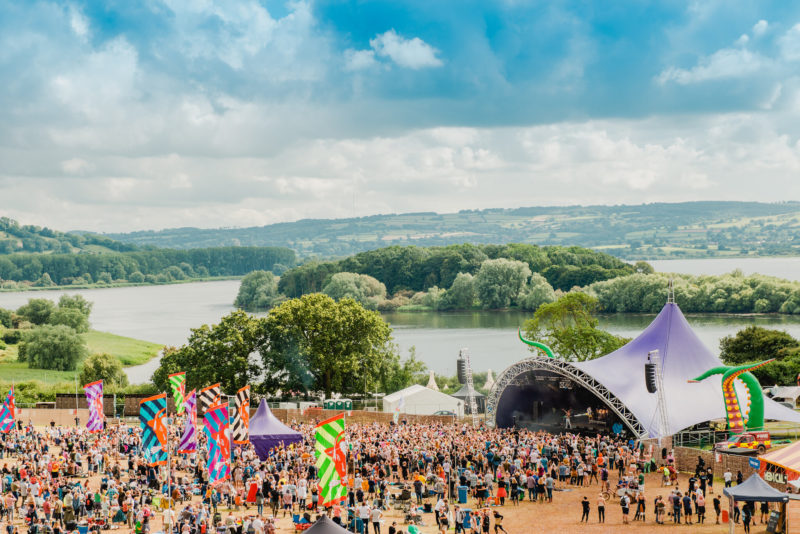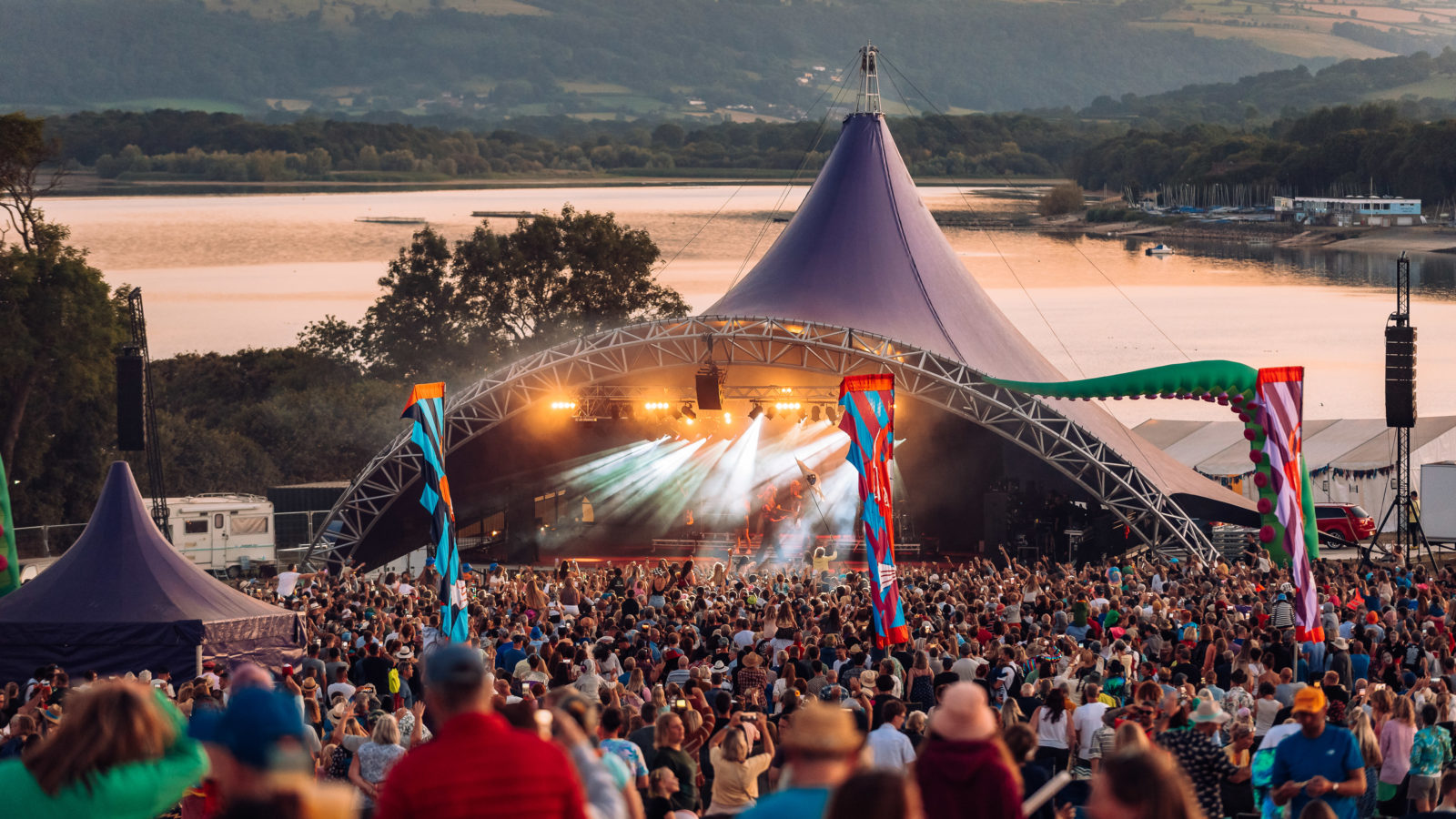 The flagship Lake Stage, framed by inflatable tentacles, looks onto a shimmering Chew Valley Lake, and as The 45s open proceedings, people scatter themselves at random around the natural rake of the hill, looking on at leisure.