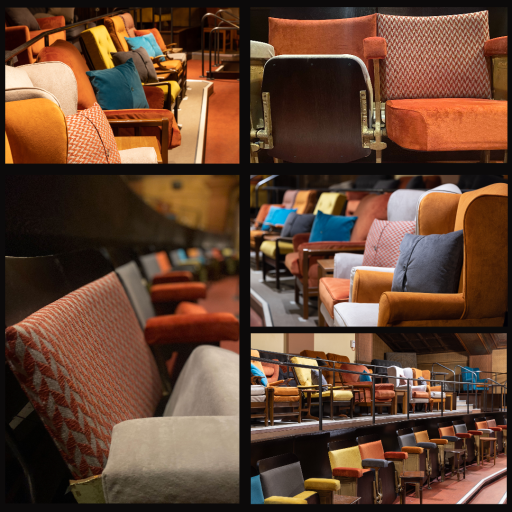 A funding campaign succeeded in raising £80,500 from the supportive local community. The balcony’s new look was conceived by CEO Susannah Shaw and Bristol architects Dittrich Hudson Vasetti, and features a variety of seating, ranging from traditional flip-up seats to laid-back sofas. All the seating has been repurposed. The flip-up seats are original to the Curzon, and the sofas and armchairs have been sourced from Clevedon’s Changing Lives and Bristol’s Sofa Project. In all cases they have been completely re-upholstered, to comply with modern fire regulations, and covered in sumptuous velvets. Other items restored for the balcony include the original 1920 chandeliers and the louvered lighting to light the steps and walkways.