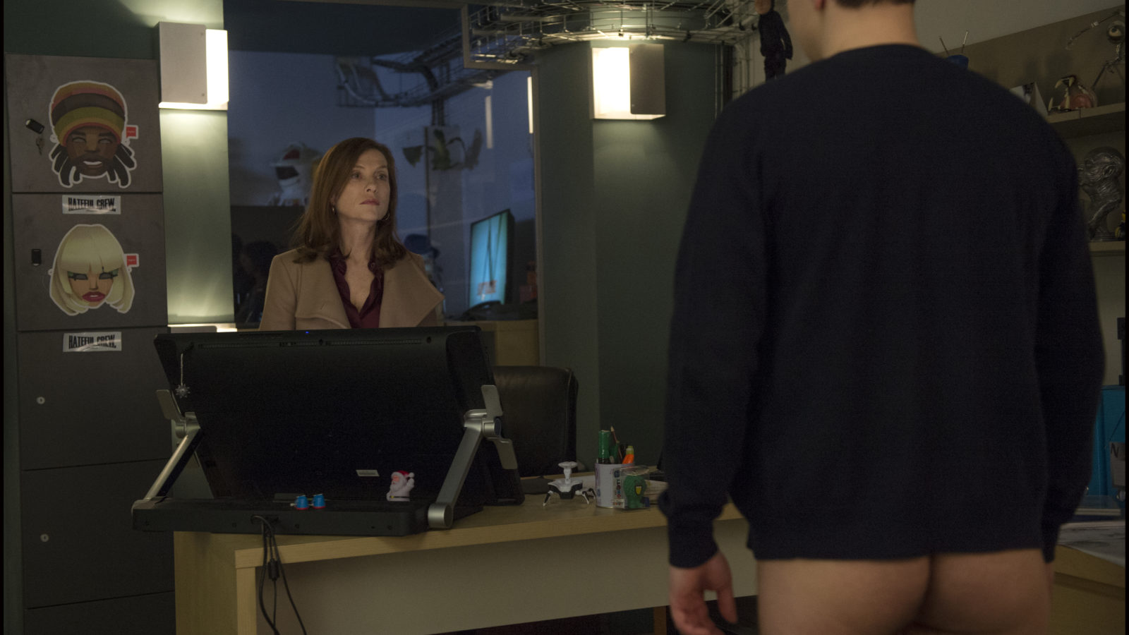 It opens innocently enough with a close up of an adorable, bright-eyed pussy cat entranced by some offscreen action. Turns out that the beast is watching what initially sounds like rough consensual sex but is in fact the brutal rape of a woman by an intruder wearing a ski mask. Once the assailant has departed, she quietly cleans up the ornaments that have been shattered in the fracas; disposes of the clothes she was wearing; soaks herself in a warm bath, observing the bloodstained foam with an inscrutable expression; and carries on with her life as though nothing has happened. We then learn that she’s Michele Leblanc, formidable late-fiftysomething boss of a successful Parisian video games company, who hectors her minions about the “insufficient orgasmic convulsions” in their latest product’s scenes of sexualised violence. She’s also conducting an affair with her best friend’s (Consigny) husband, which is interrupted only briefly by the assault.
