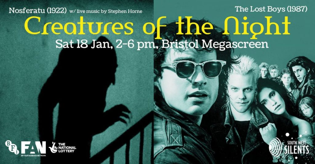 To celebrate a glorious decade of screening the best vintage silent films in the UK, Bristol-based South West Silents is staging a season of double-bills at the Bristol Megascreen (formerly the IMAX cinema in the aquarium). The idea is to pair silent classics with well-regarded more recent films. First up is F.W. Murnau’s 1922 masterpeice Nosferatu, teamed with Joel Schumacher’s The Lost Boys (1987) on Saturday 18 January. Go here for tickets.