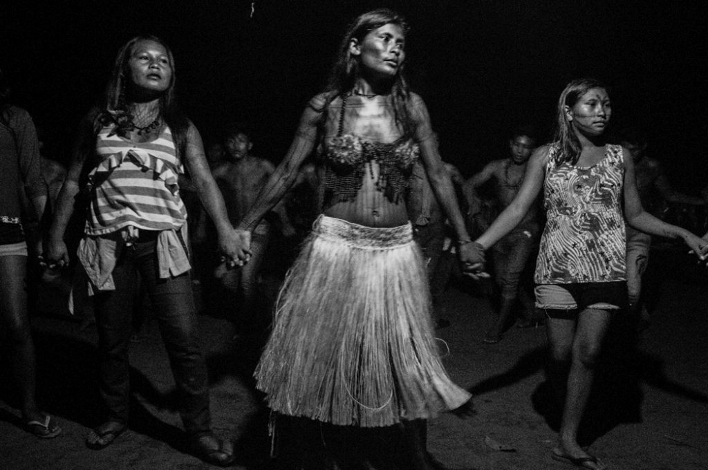 Munduruku women and men dance and sing in the ritual at the Katu village cultural night, Amazon, Brazil. Photograph: Priscilla Tapajowara