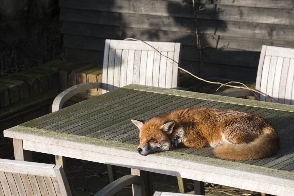 Red fox (Vulpes vulpes) asleep on garden table, Ashdown Forest, Sussex, England. Pic: James Warwick/Wildscreen ARK