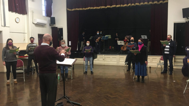 Bristol Ensemble and the Exultate Singers rehearsing the Vaughan Williams’ Fantasia on Christmas Carols at Shirehampton Public Hall. Photo – Judith Odgen