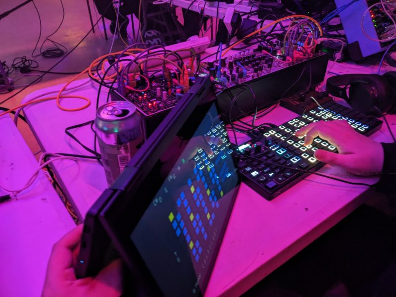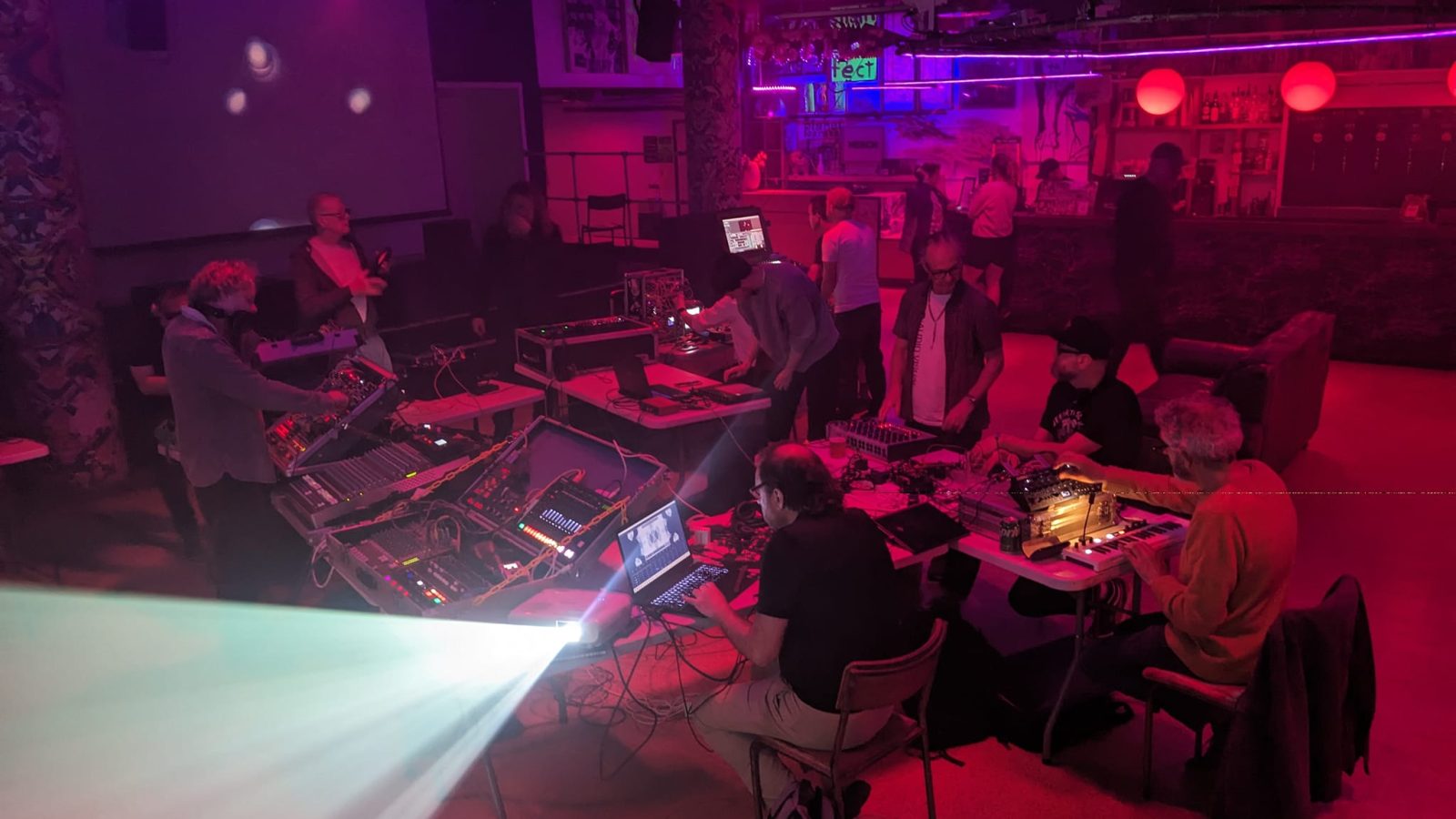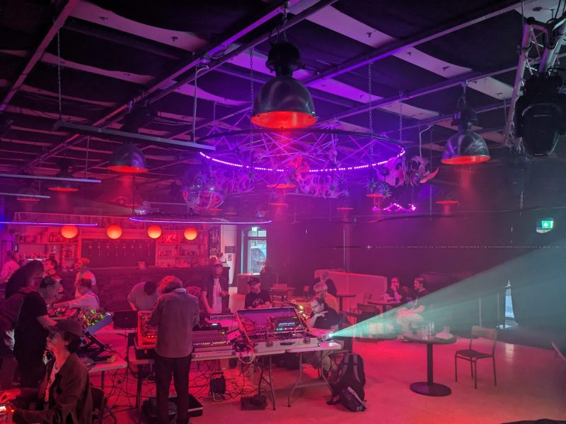 “There’s usually about 15 people at least plugging in and five-to-ten who come and check it out. It’s a friendly, bubbling space to hang out, chat oscillators, drink beer, listen to weird stuff and watch amazing visuals.”