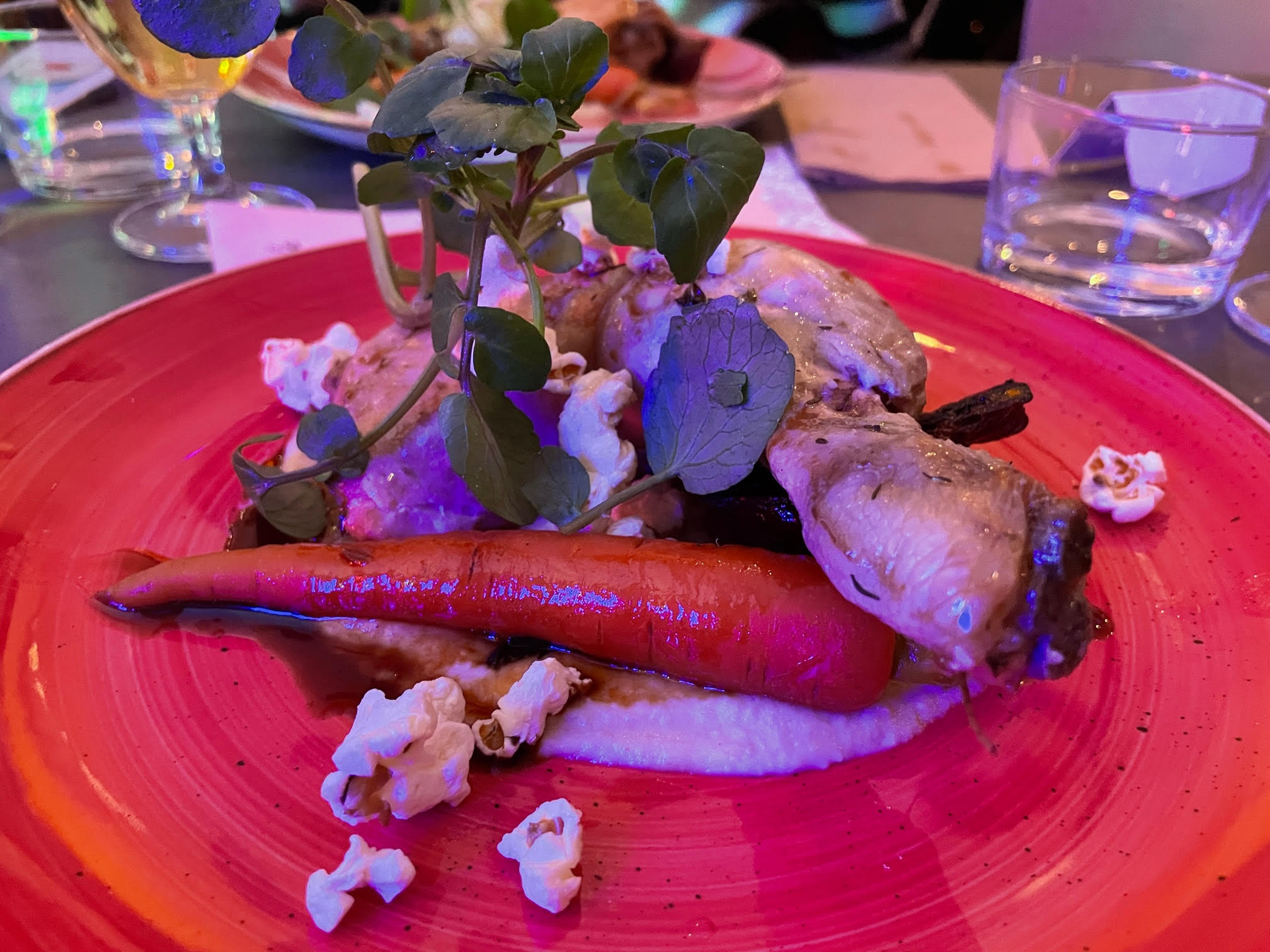 Hay-baked chicken leg, garnished with popcorn, sat atop a celeriac puree and was accompanied by a carrot – photo: Meg Houghton-Gilmour