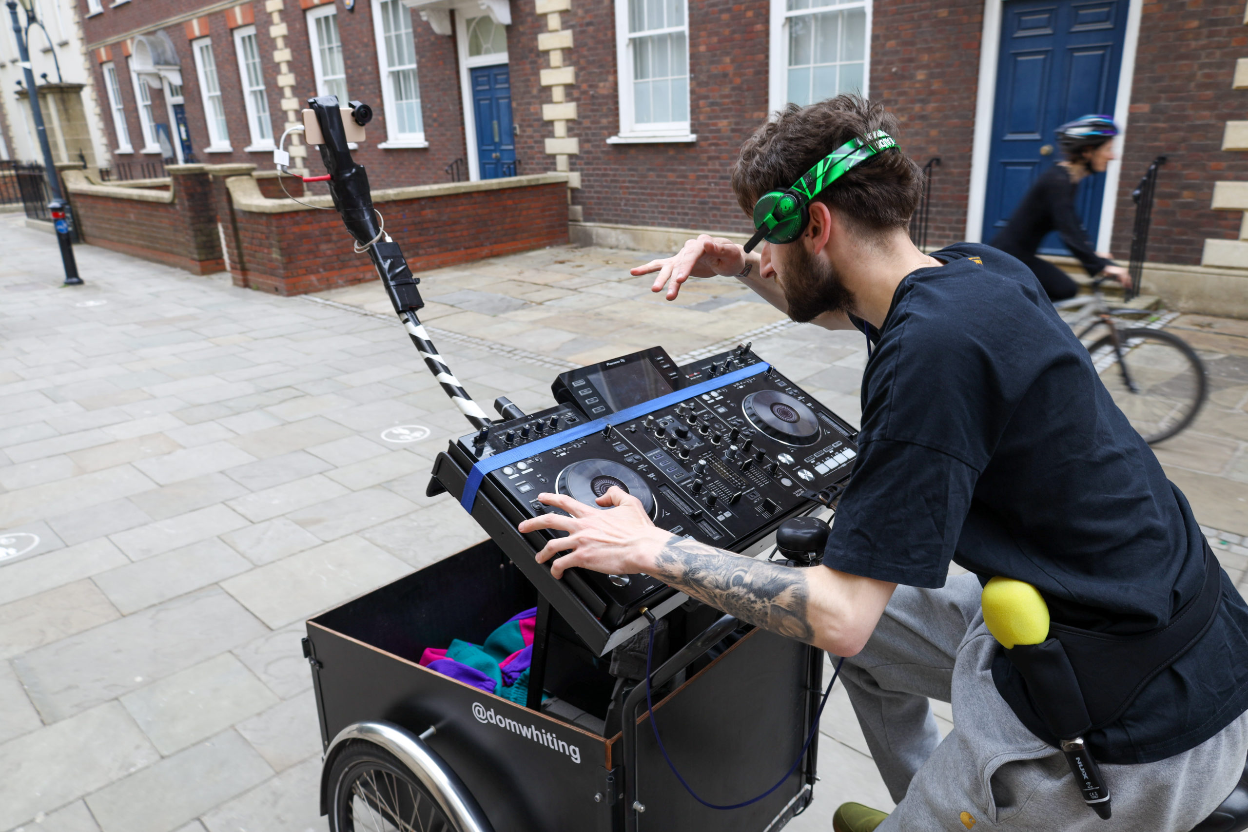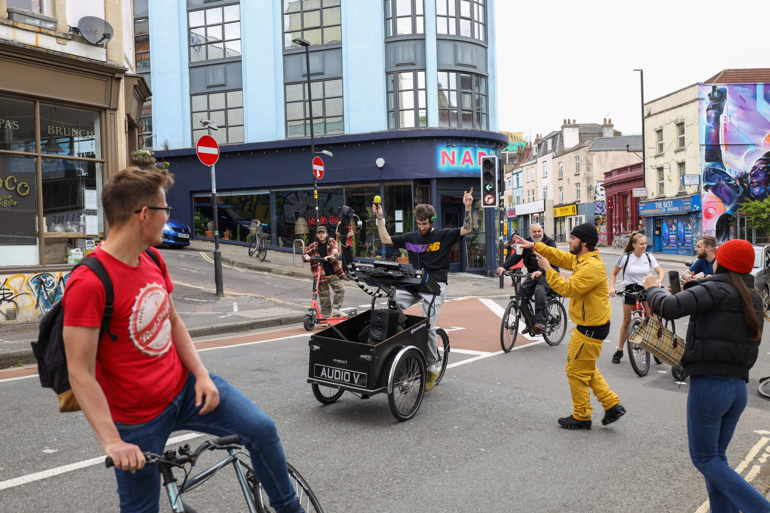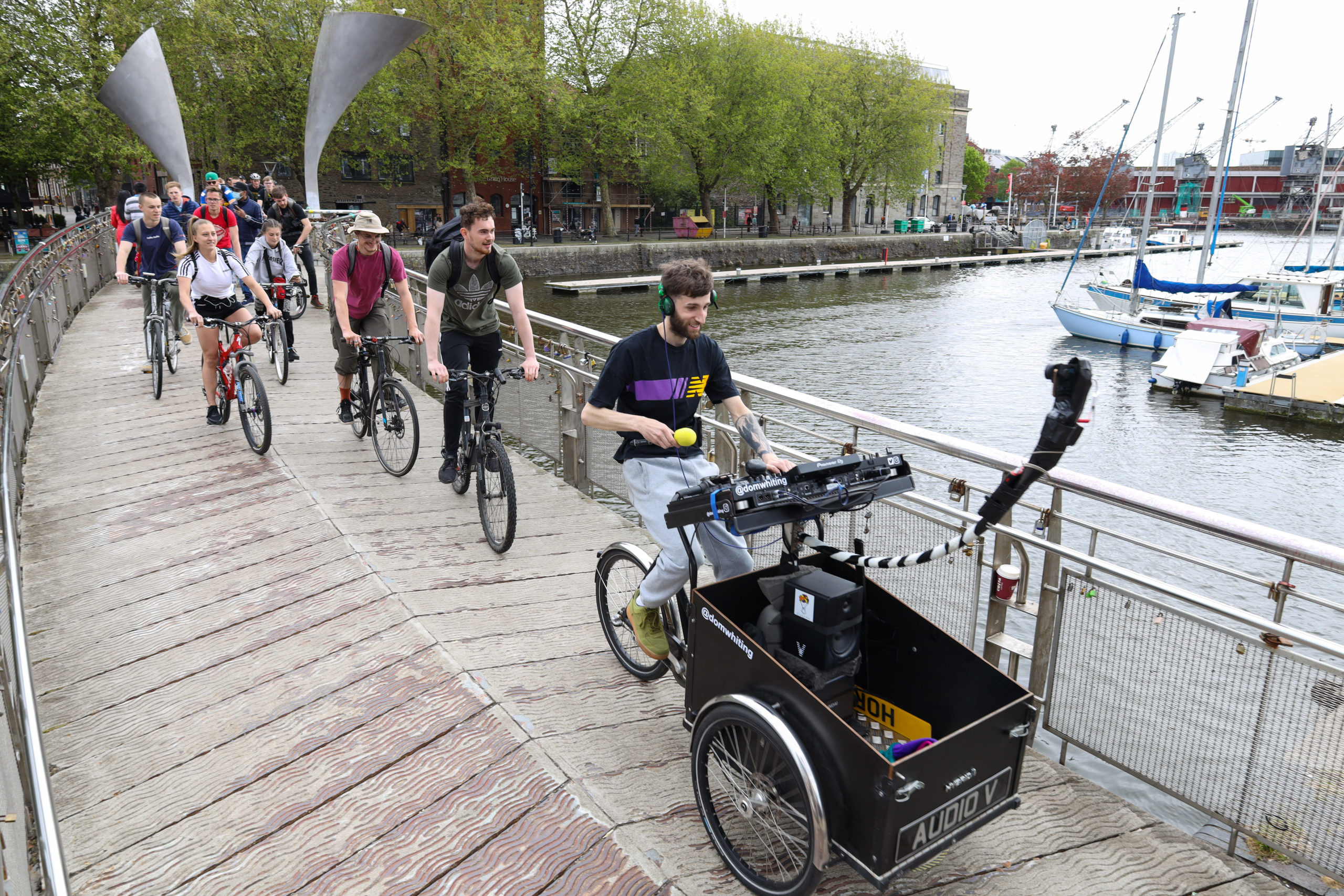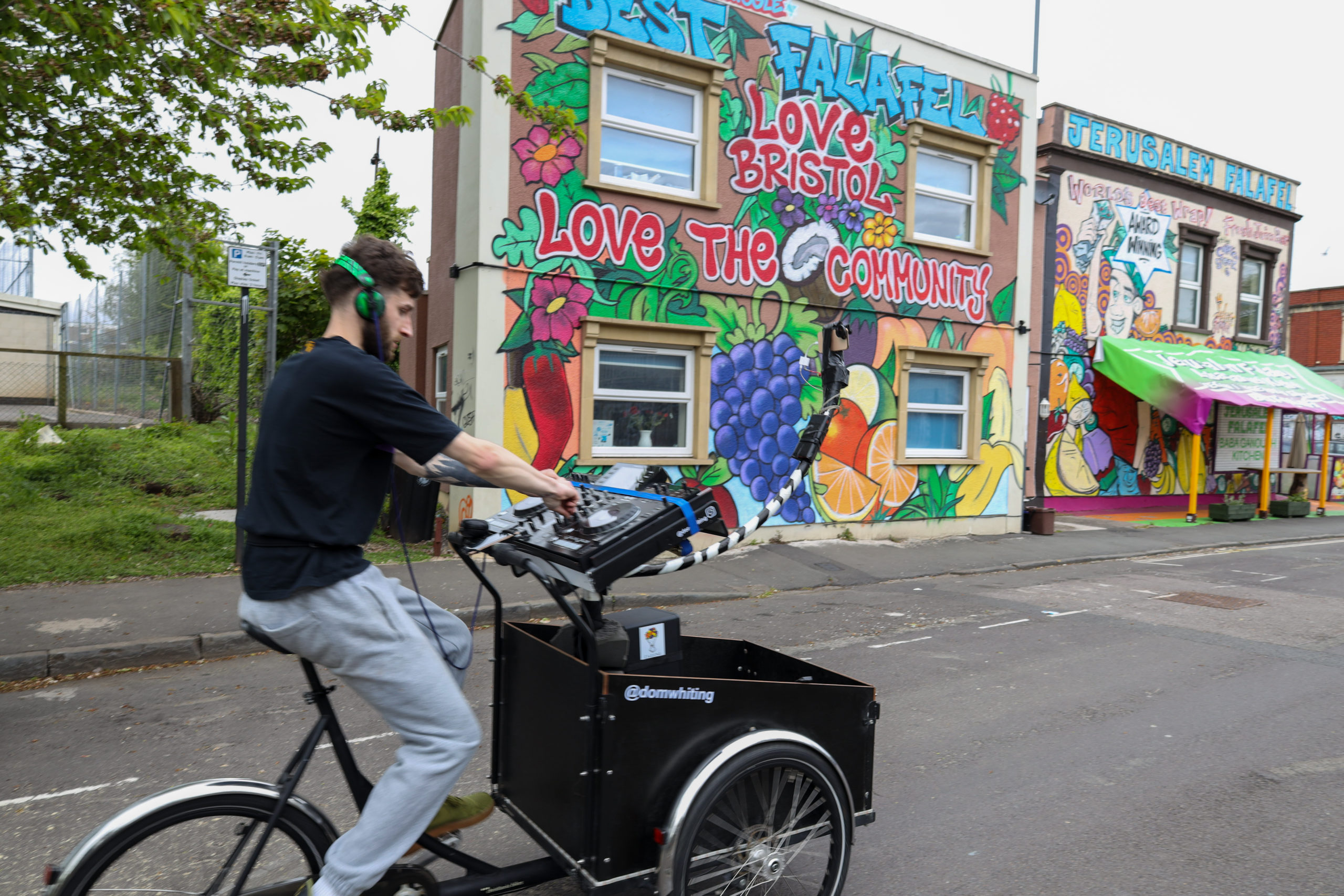 A DJ who has made his name by cycling around towns and cities on his tricycle while livestreaming sets has made his first visit to Bristol.