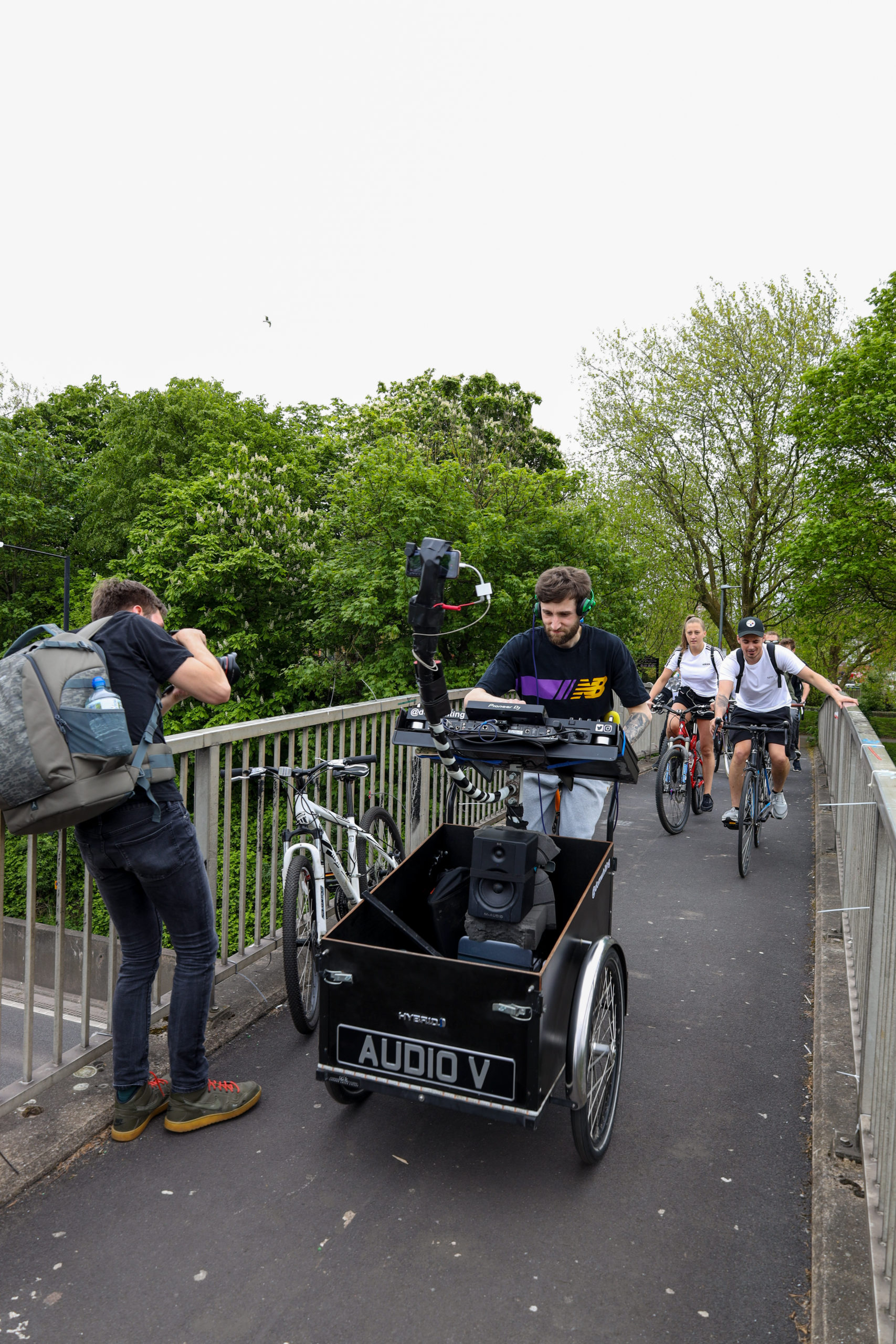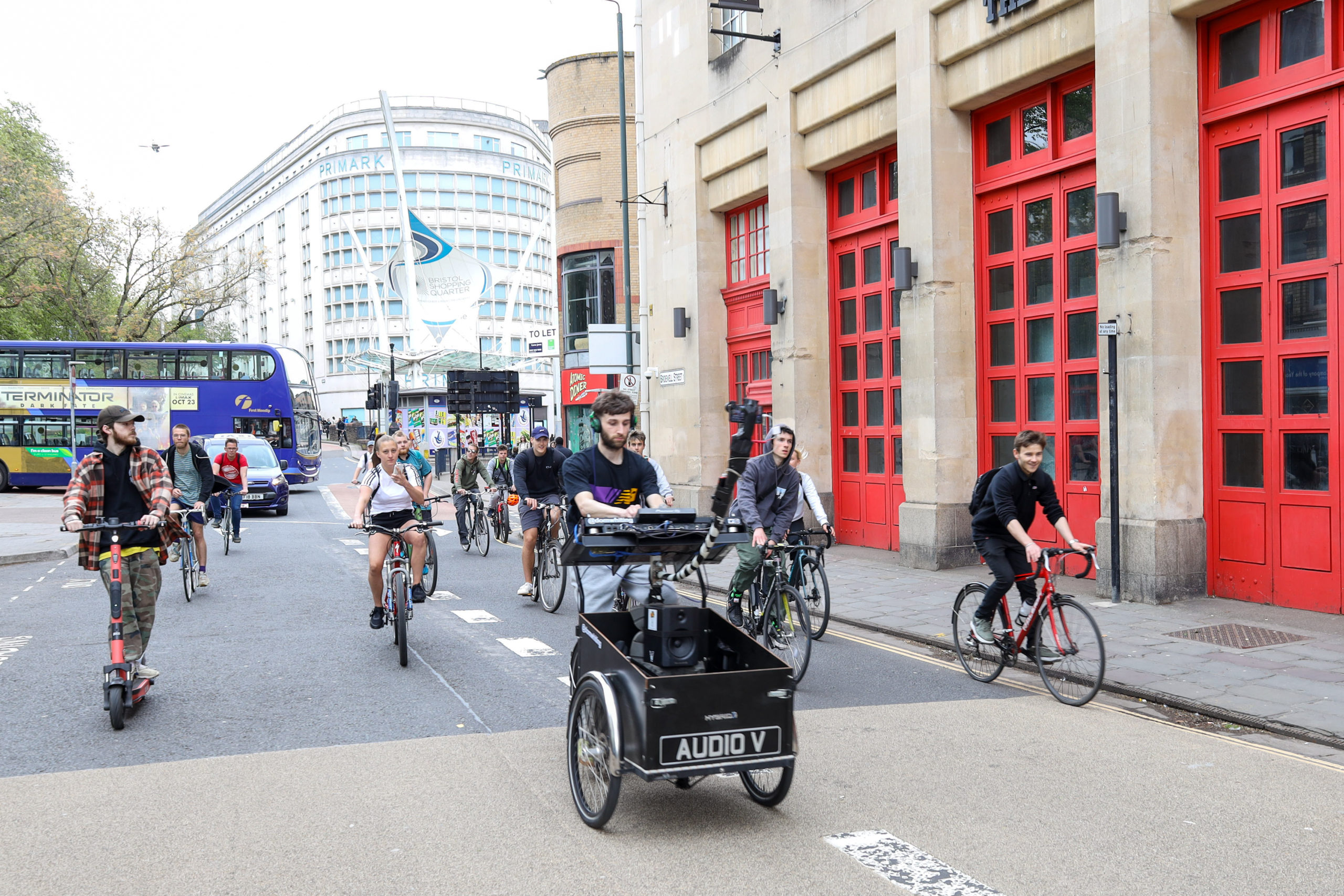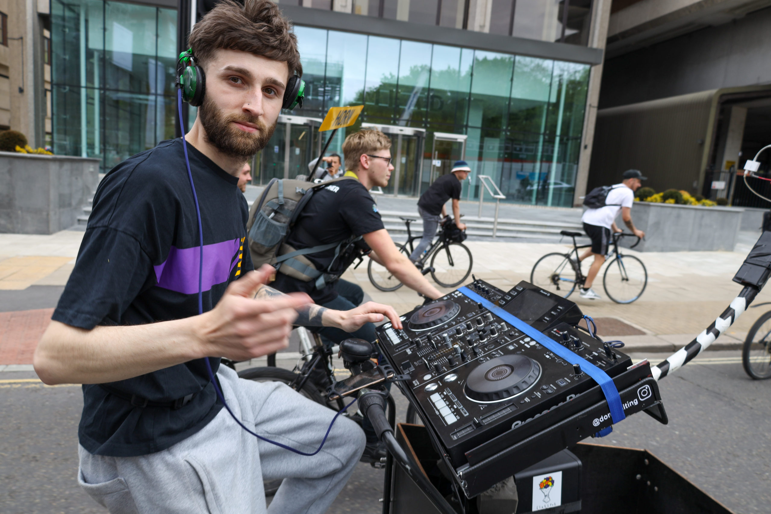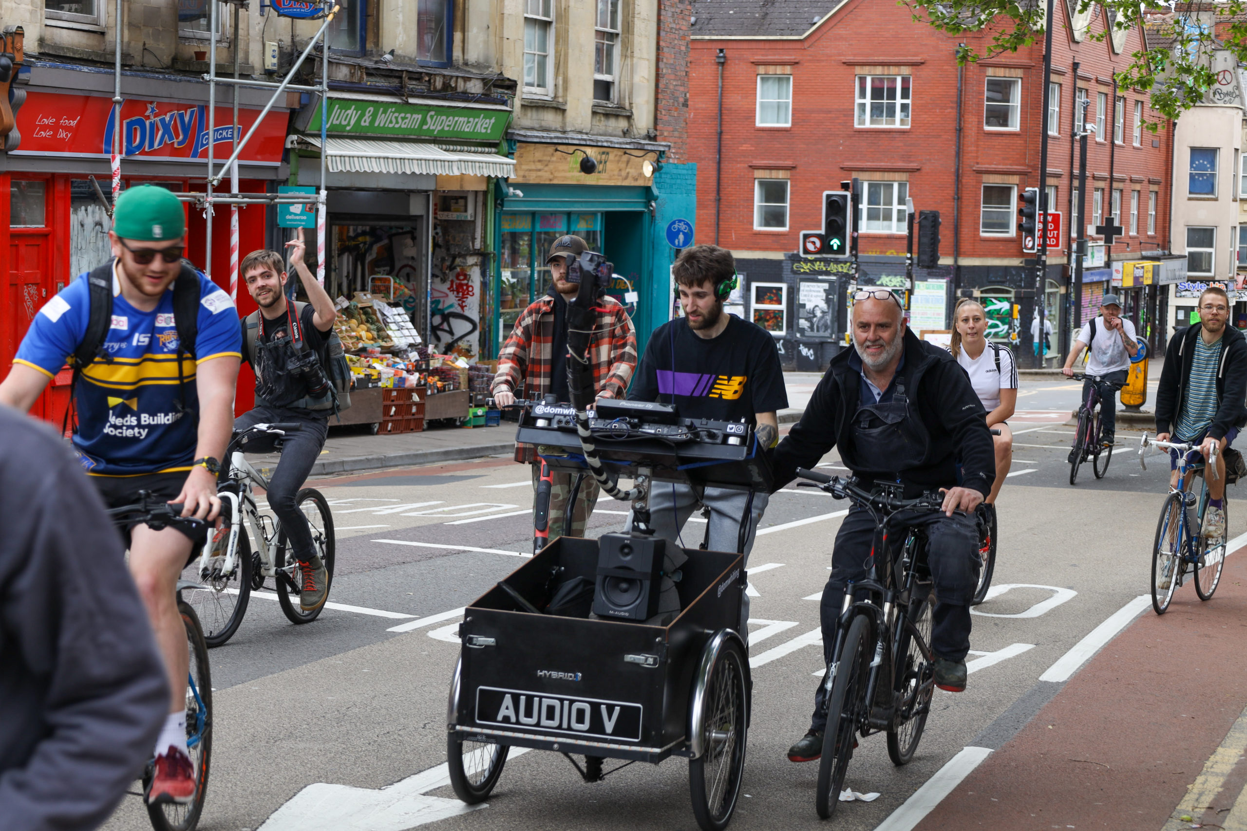 A DJ who has made his name by cycling around towns and cities on his tricycle while livestreaming sets has made his first visit to Bristol.
