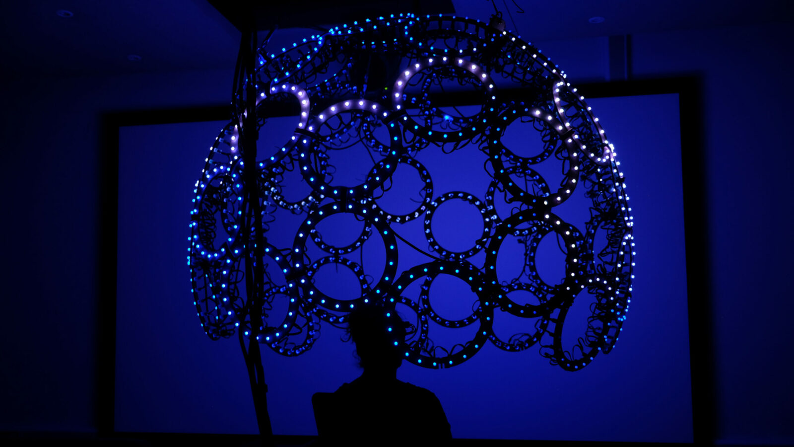 The installation reads a participant’s brainwaves while listening to music and renders the results onto a laser-cut ply dome with 950 LEDs embedded into the structure.