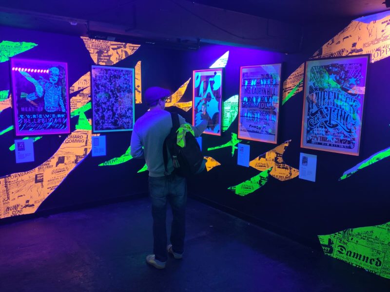 The exhibition features neon and UV-augmented reimagined gig posters – photo: Ursula Billington