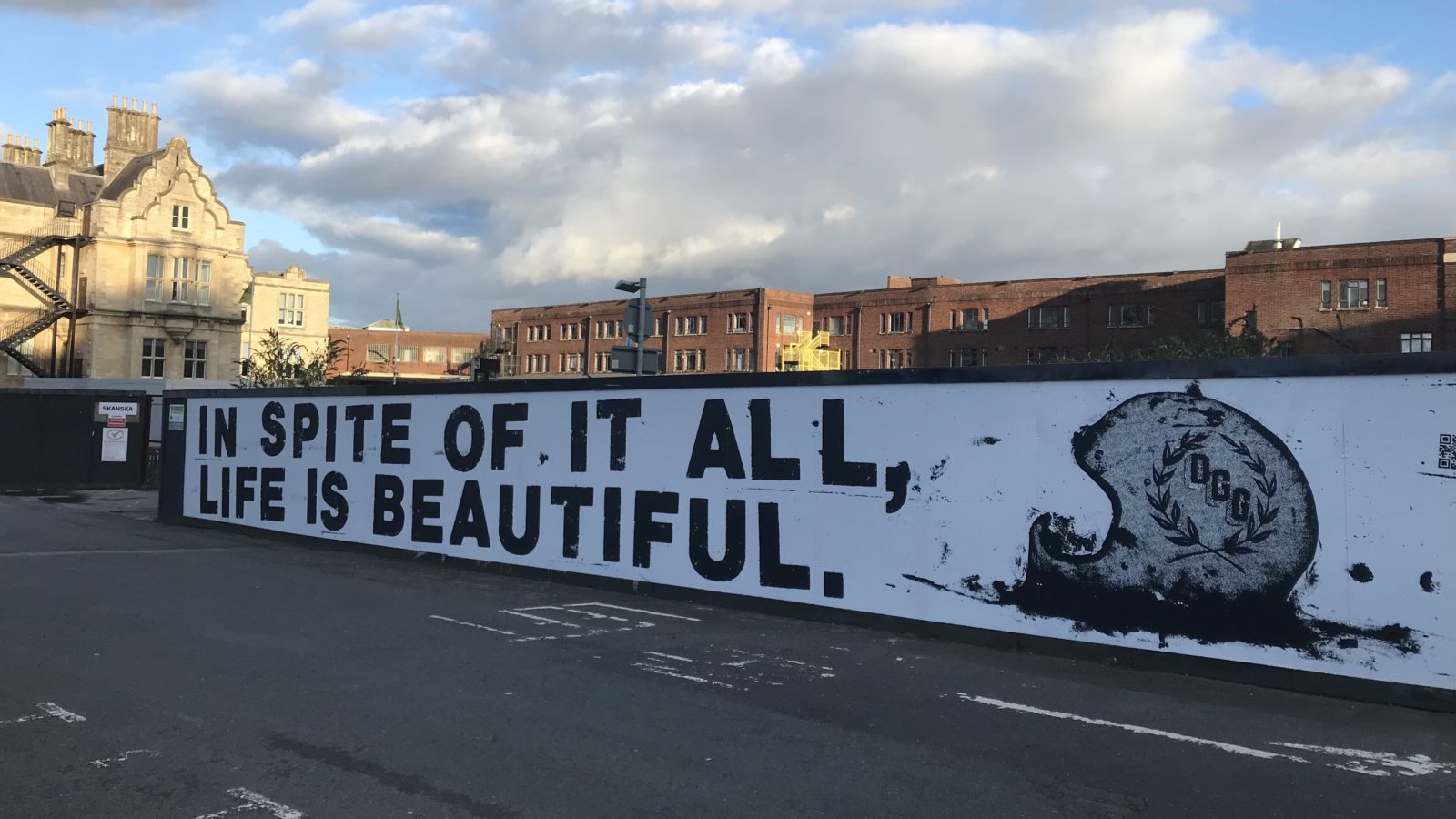 ‘In spite of it all, life is beautiful’ reads the sign on Lower Approach Road.