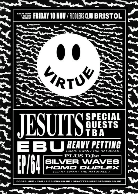 Virtue is the Jesuits-curated event that will be packing out Bedminster’s Fiddlers this month – and, in the band’s own words, the line-up consists of “friends that have inspired us.” Miles is looking forward to seeing EP/64, an improvised, groove-based trio that features a charismatic singer with a signature dance style. “Sometimes you think you know everything that’s happening in Bristol, and then you see something like that – I had no idea something so exciting was happening under my nose,” says Arthur.