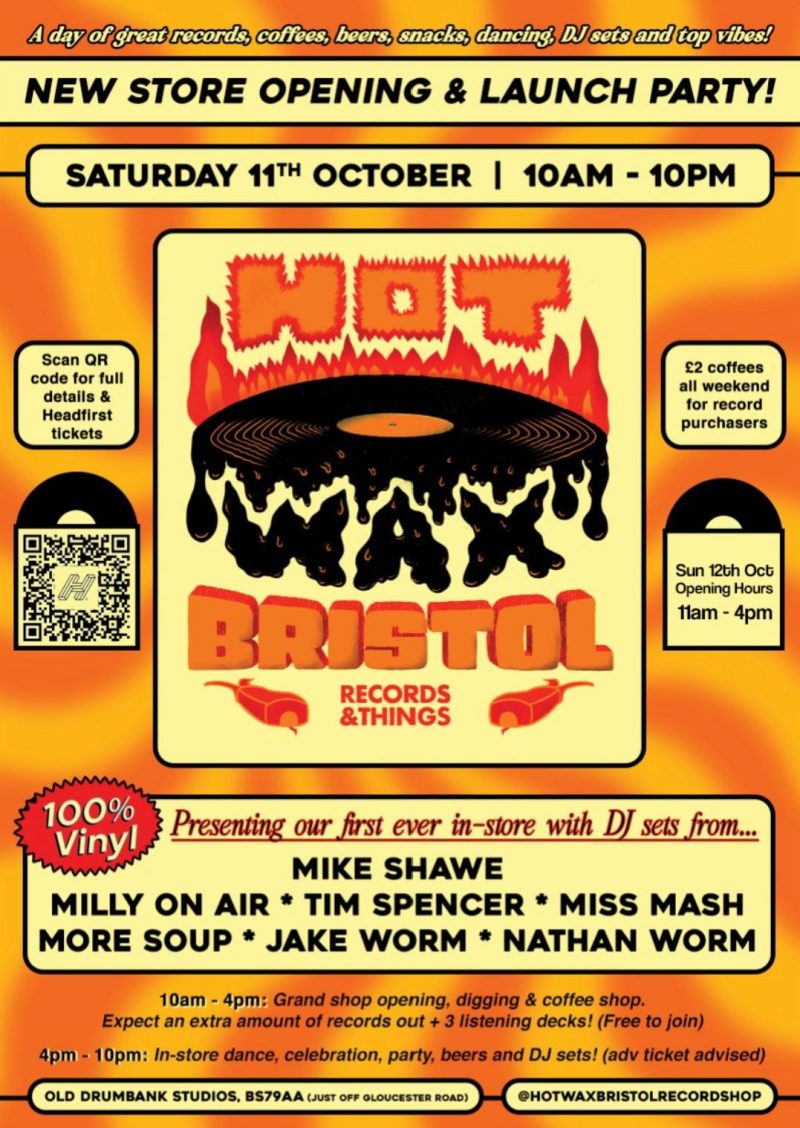 The Hot Wax launch event takes place on October 11 from 10am-10pm. Find all information at headfirstbristol.co.uk/whats-on/the-old-drumbank-studios-sommerville-road-/sat-11-oct–hot-wax-record-shop-opening-party