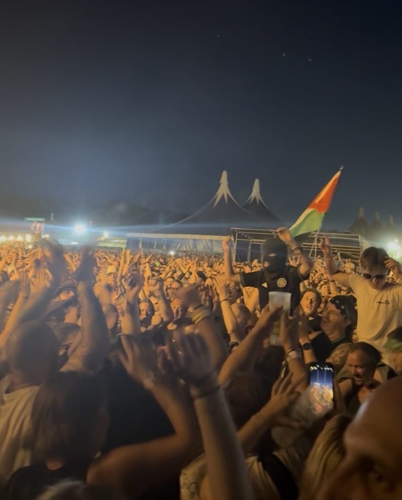 They aren’t the only ones waving the Palestinian flag, they’re joined by Bambi Thug, Kid Kapichi and a quarter of the festival goers who have lined their tent with a Palestinian flag.