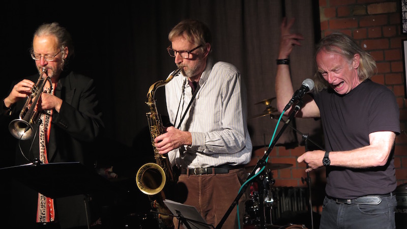 The Blazing Flames kicked things off with propulsive energy and a kind of subverted jazz-rock sound, harsh brass tones from David Mowatt’s trumpet and Mark Langford’s tenor sax playing off Peter Evans’ stabbing violin. It created a flow that Steve Day rode with his Back Into The High Tide poem, incendiary verbal phrases thrown into (and across) the beat, repeated for emphasis and howled throughout to provide as much a musical contribution as angry lyric. For Russian Doll the band’s moderated approach used internal trios such as violin, drum and bass to provide a more spacious setting for the rueful poem.