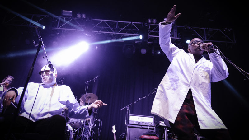 Meanwhile The Spirit of Love and Wizard laid down swirling synths and took it to the church with the gospel keys, both triggering all manner of sounds and samples. Although a bass was visible on stage, it never left its stand but the band had tremendous gut wrenching bottom end throughout thanks to the mighty L B Dope’s sonic boom, pounding the kit but never overpowering the material. He really was at the heart of the set – with the organised chaos of the tempo changes, the samples and the multiple vocals and rapping he kept every tune on the one, never losing the beat.