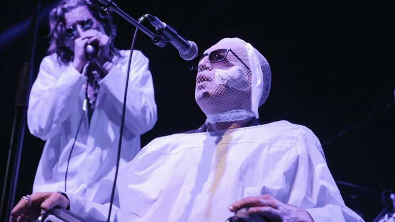 The band are still visually stimulating and engaging too, they know how to put on a show. Albeit they have an off-kilter approach to showmanship. Larry Love had been wheeled on stage in a wheelchair and surgical gown, inexplicably wearing a pair of tights a-la yer typical clichéd seventies wrong-un from the Sweeney. Wheelchair wrangler Strangelove looked like a psychotic doctor and with the presence of a transvestite nurse on keys, and lab coats all around the band looked ready to provide triage at a rave gone bad. Really bad.