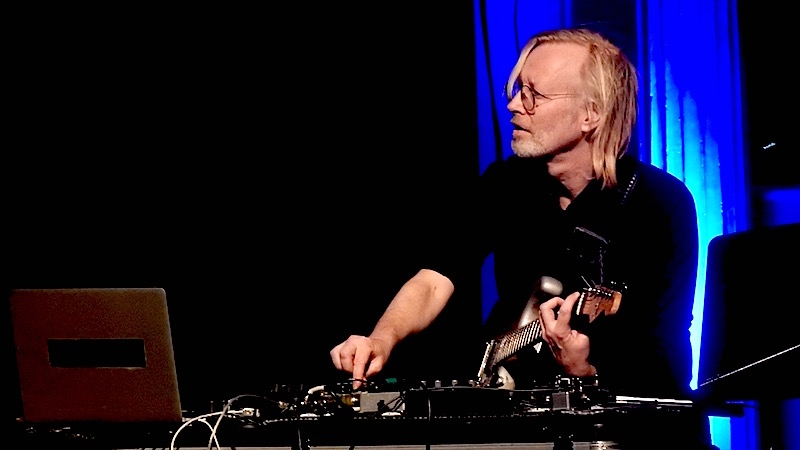 The new music is a clear continuity from the previous album, if anything it was even more understated and restrained than that languid set. When there were solos each player delivered something elegant and stylish but completely free of bombast, often slipping back unobtrusively into the flow of the music like a film fade-out – and indeed there was something cinematic about the atmospheres being created and the development of the tunes. One number opened with a soulful and expressive bass intro that suddenly jump cut into a snappy, almost country and western song structure – it even had the notoriously abstract Aarset playing like a guitarist for most of it, sweeping major chords for Andy’s sax to dance over before suddenly opening out into a post-psychedelic onslaught of layered sustain, the Norwegian guitarist’s nimble fingers dancing around his table full of effects devices.