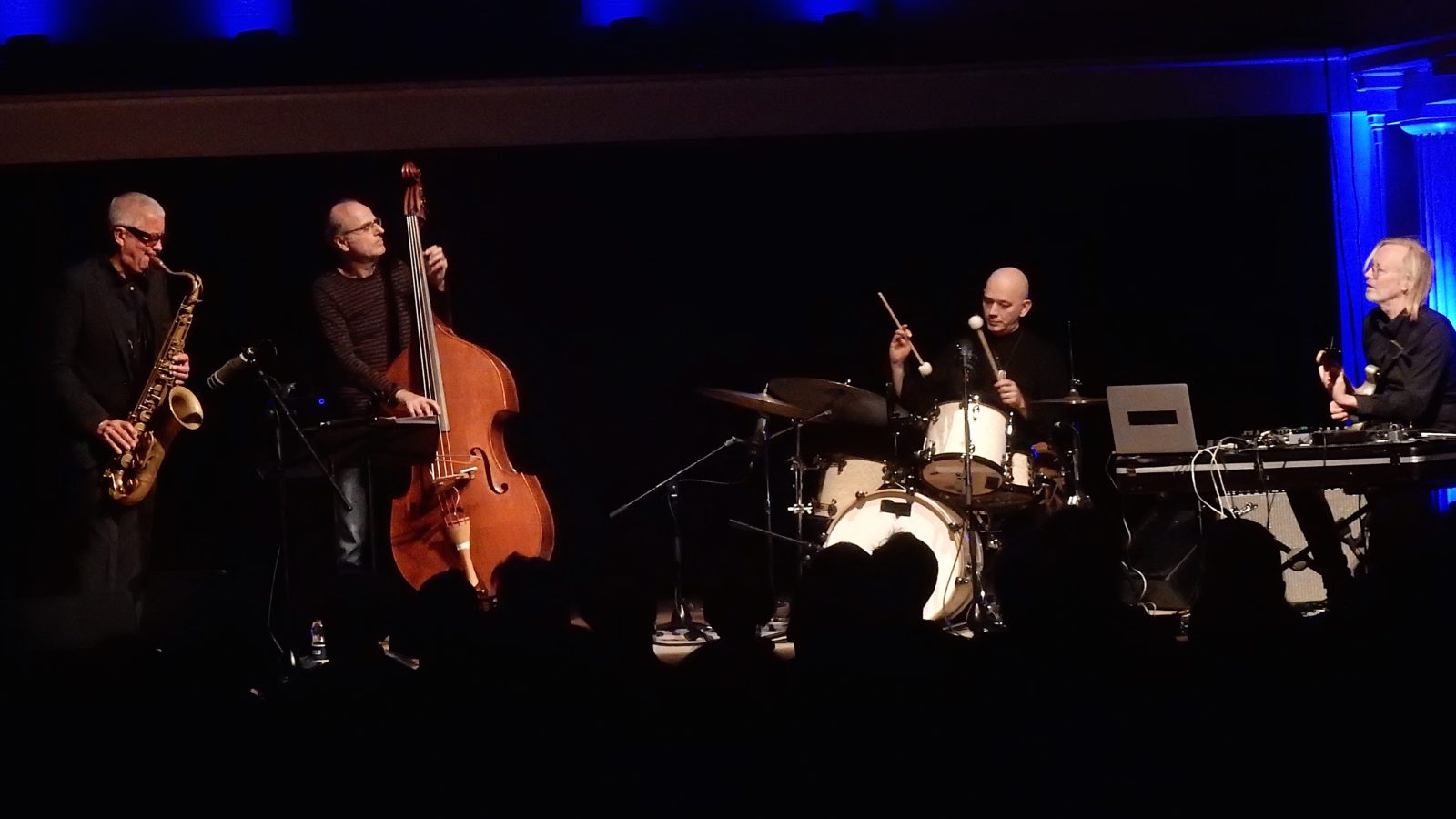 The quartet is the one that recorded Surrounded by Sea, Andy’s previous waxing, an impeccably compatible group of listening musicians that suits Andy’s compositional approach perfectly. The opening number (Andy ’s famously diffident stage manner meant we almost never learned the titles) was a case in point: a stately, wistful melody delivered on breathy tenor saxophone, underpinned by a soft-toned bass pulse while drummer Sebastian Rochford and guitar electronicist Eivind Aarset slowly wrapped it in delicate ambience. Their contribution was minimal but effective, as nicely judged as Michel Benita’s fluent bass, and the whole sound came together at once.