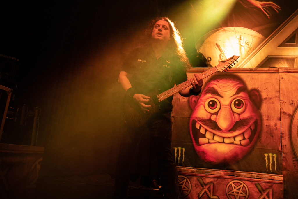 Then the curtain drops and there they are in the flesh, hammering their way through Among the Living. Bassist Frank Bello is bouncing around like a teenager, making full use of the posing podiums, powerhouse drummer Charlie Benante is in total command of his huge kit, and there’s no let-up from rabble-rousing vocalist Joey Belladonna – even though he still seems like a classic rock guy fronting a thrash metal band – while newest recruit lead guitarist Jonathan Donais tends to avoid the spotlight. Scott Ian, meanwhile, remains a focal point, churning out riff after riff on a succession of flying Vs (just how many does he have?).