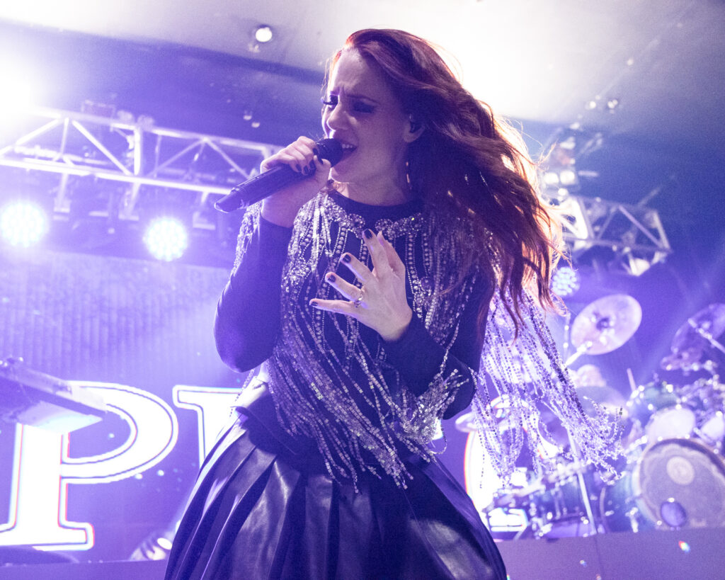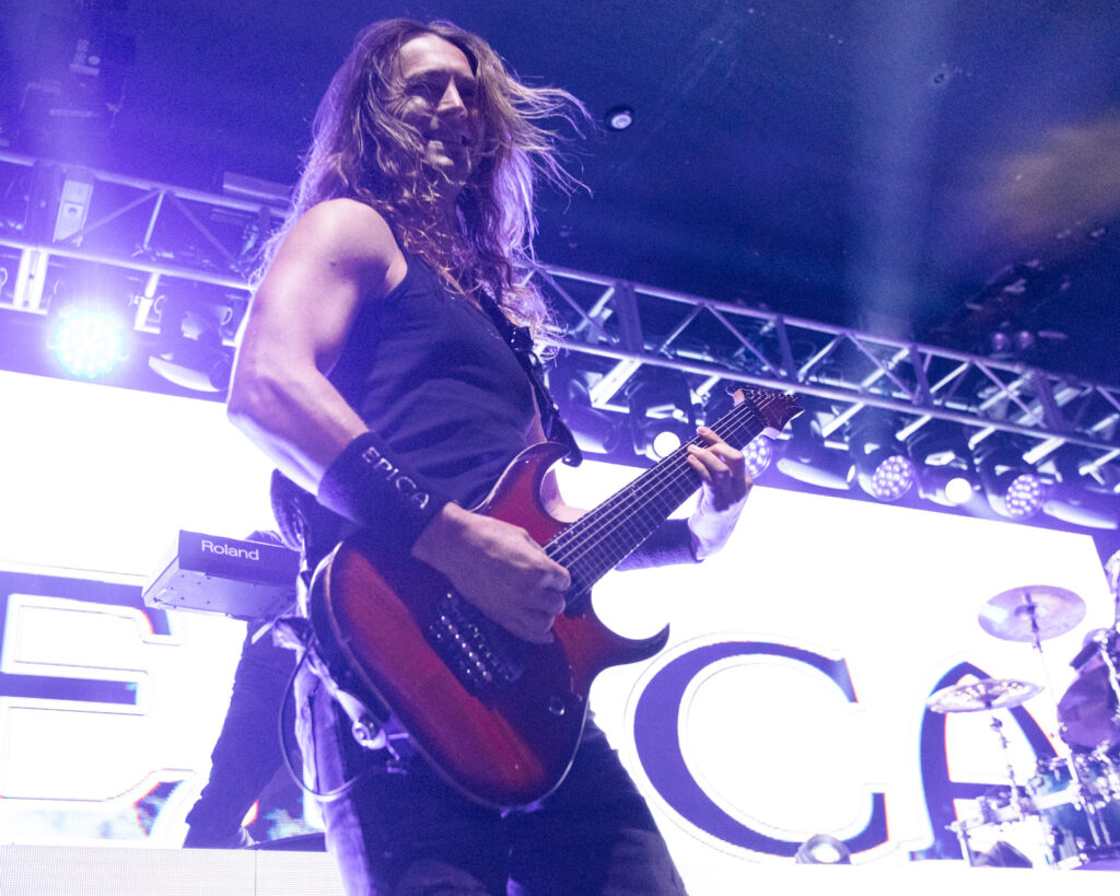At first, singer Simone Simons negotiates the steps between levels a little tentatively in her goth boots, but she’s soon romping around, headbanging furiously and attempting to orchestrate the occasional wall of death, though the audience are packed in so tightly that this proves difficult to achieve. Despite all the cavorting, she never misses a note.