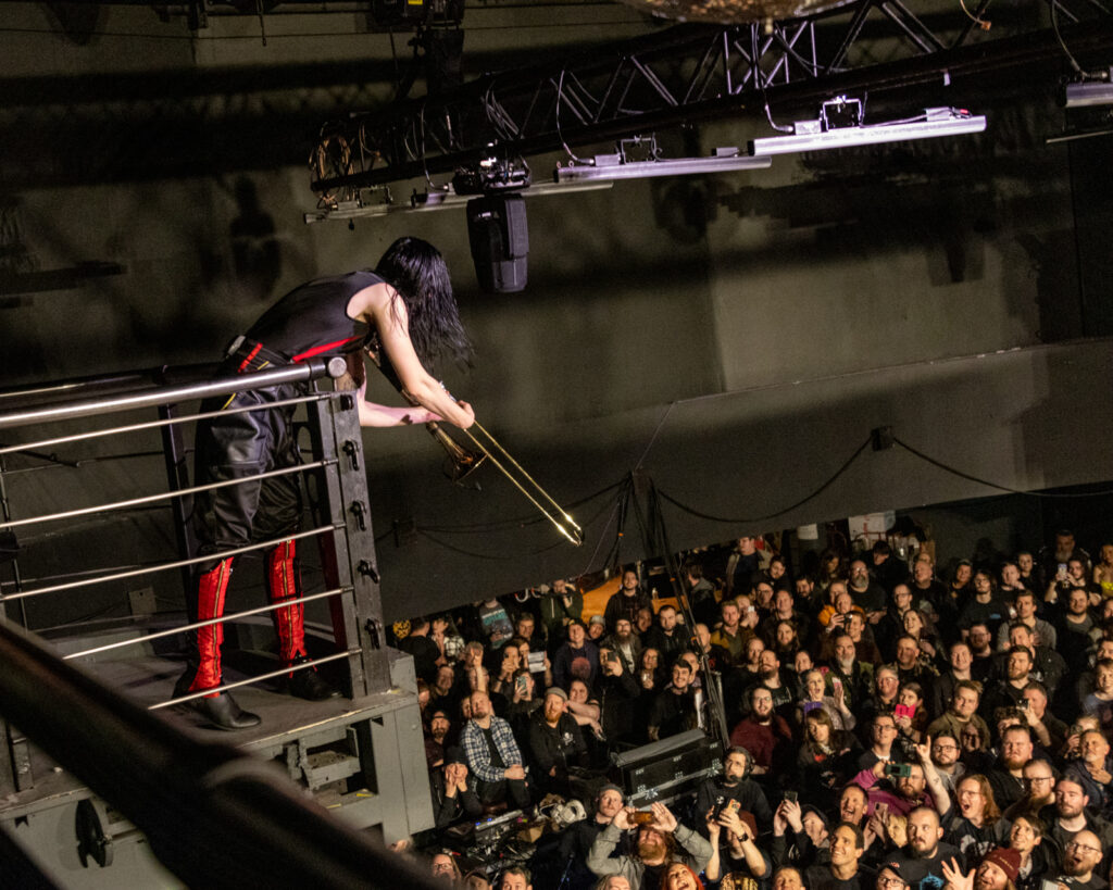 The band feign bafflement when he disappears during Puppet Show, only to reappear on the balcony where he makes a balloon animal, which he drops into the sweaty throng, and performs a trombone solo. Indeed, balloons are quite a feature of this show (as are pyro and streamer cannons). Heavy metal needs more balloons. And trombones.