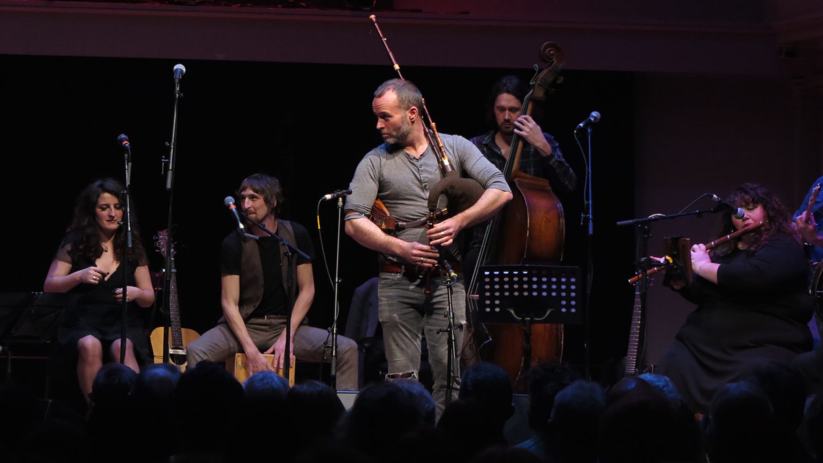 Of course there were folk tune sets, which prompted a few brave souls in the balcony to dance along the aisles, and again the arrangements made great use of the band’s multi-instrumental resources. Whenever they appeared Dave Tunstall’s sharp sounding border pipes could be relied on for a welcome cheer, but Ewan MacDonald’s ringing cittern also added distinction. These sets were the more raucous part of the evening, and rightly so, yet never ragged and always crisply rhythmical.