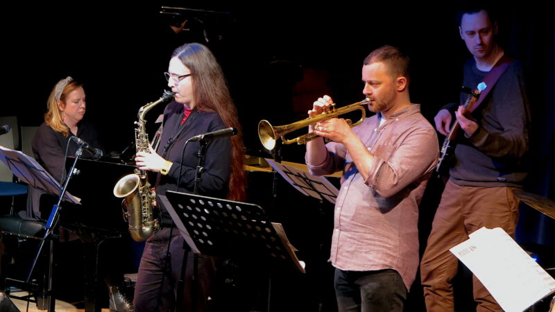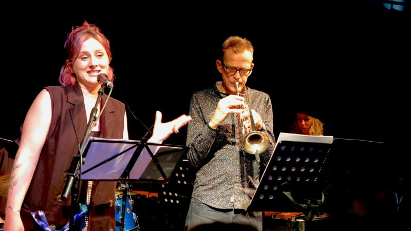 Sunday’s triple bill opened with a remarkable suite for a seven piece jazz/classical ensemble composed by trumpeter Pete Judge and percussionist Harriet Riley around the words of young poet Jj. Comfort in Chaos could have been a grim business, given the subject matter of Jj’s experience of childhood abuse and consequent mental health issues. However, the defiant power of her writing and her assured delivery coupled with some exquisite musical writing and playing to somehow ensure it was a life-affirming celebration. Clever use of the three string players, the warm clarity of Harriet’s marimba and the gentle tones of Pete’s trumpet all contributed to the emotional climate and they were justly rewarded with the weekend’s only standing ovation.