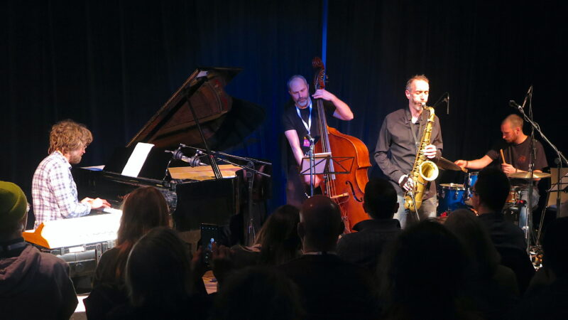 And then all that remained was for saxophonist Jake McMurchie to put the icing on the weekend’s cake with his fine quartet including Dan Moore on piano, Riaan Vosloo’s bass and Matt Brown drumming. Opening with Jake’s tune With Grace they set out their stall: a skeletal melodic sequence fleshed out into a rolling riff, a hard-bopping sax outburst giving way to a busy drum-powered piano trio as Dan’s increasingly unhinged soloing yielded to Riaan’s unhurried and reflective bass. Musical personalities established, they maintained a top quality standard throughout, with Jake’s fellow Get The Blessing horn man Pete Judge joining for the GTB’s The Word for Moonlight Is Moonlight, much to the audience’s delight. The original quartet played out on Jake’s And You Are, a brisk Blue Note sounding number that gave both the sax player the chance to nod to his hero Sonny Rollins in a tour de force solo and a thoroughly appreciative audience the perfect upbeat end to the weekend.