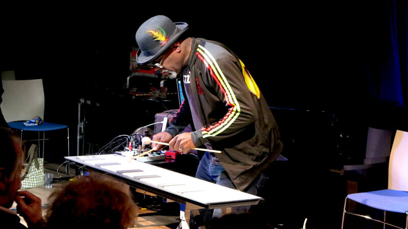 Opening Saturday evening Robert Mitchell’s True Think (pictured at top) were sadly bereft of Swedish vocalist Liselotte Östblom – and thus the words of their songs – but made up for it with extravagant fusion soloing. Zayne Mohammed was particularly impressive on guitar, unleashing dazzling torrents of triplets while Mitchell himself swaggered nicely at times. Orphy Robinson, however, had brought all his vocalists on a hard drive, weaving an improvised soundtrack on solo vibraphone through a sequence of recorded voices unpicking elements of racial awareness. Going from neglected black historical figures to the infamous “Where are you from?” controversy it was all valid stuff, if a little unfocussed.