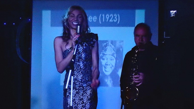 The Thunderbolt looked like a chapel, with rows of chairs that even had those little shelves on the back for hymn books, and indeed there was something of the memorial service about this gig. With a lectern to the side, a microphone stand in the middle and a projection screen at the back we were set up to be taken on an appreciation of blues singer Bessie Smith, one of the true legends of black music history. Small Days guitarist Dave Merrick was the master of ceremonies, reading through Bessie’s story with the help of slides, old recordings and even a clip of film from her only cinema performance, with vocalist Natalie Davies and sax player Brendan Whitmore joining him for the occasional live song.