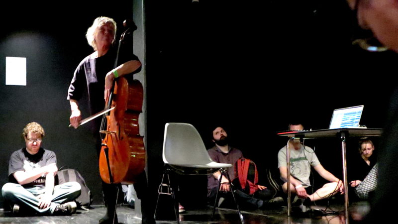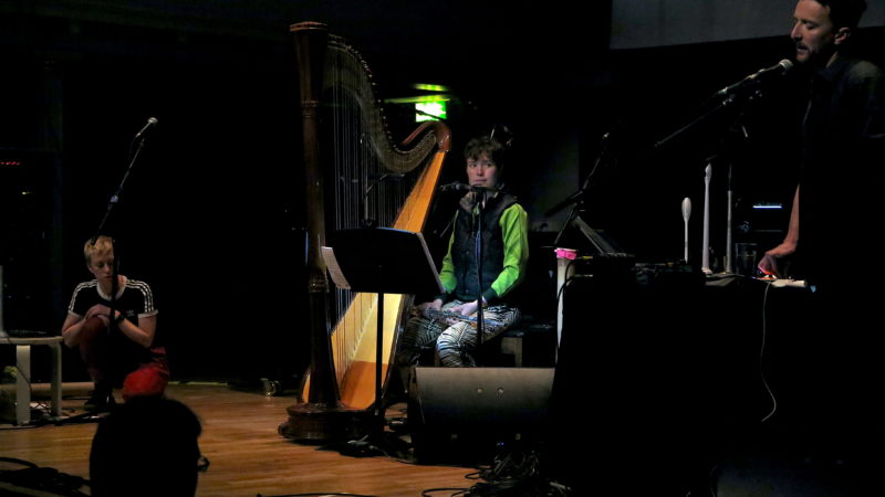There were literally hidden depths to Shirley Pegna’s Earth Din project, which used the sounds of the Earth’s internal grindings picked up from Indonesia, Fiji and Greece by a seismometer. These were overlaid with ‘sferics’, the radio wave bursts made by lightning storms in the ionosphere. The uncluttered field recordings created an unpredictable stimulus for Shirley’s cello with Dominic Lash on ‘bass violin’ and Angharad Davies’ violin. All seasoned improvisers, the trio’s sound vocabularies were as varied as the outbursts of static and unearthly wrenchings. With the players also continuously repositioning around the Arnolfini’s dimly lit Dark Studio it was another enhanced listening experience, their bows wrenching and scratching at the strings and bodies of the instruments. At one point Dominic even used his tuning pegs to make rasping croaks, at another they layered their bowed sound into tectonic plates with fossilised groans exhumed from prehistory. Or so it seemed.