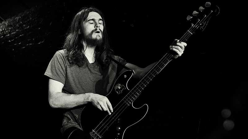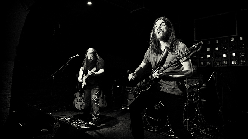The band were super tight throughout the set, McGrathon’s playing expressive and expansive, forceful runs and melodic counterpoints leaving O’Hanlon free to solo and riff – short sharp solos in service of the songs and percussive riffs powering the tunes. He was mostly static at the mic, leaving McGrathon prowling the stage, throwing shapes, foot on the monitor and gimlet eyed whilst machining gunning the crowd with his bass. Barrett was an exceedingly solid presence, his beats powerful yet devoid of unnecessary frills, driving the tunes and enhancing the songs with his backing vocals. The combination was fresh and intriguing, their influences on display but not a band in thrall to genre clichés or aping either their predecessors or contemporaries.