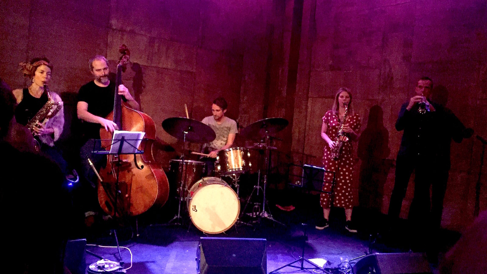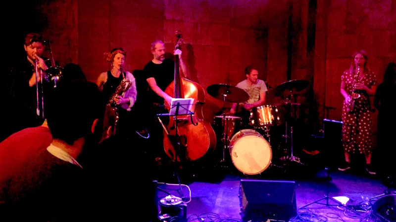 It’s now seven years since the first quartet version of Dakhla Brass unleashed their unique drum’n’brass sound on a tantalisingly short EP In The Land of Milk and Honey . Since then they’ve changed and grown both in line-up and musicianship and latest album Murmur, launched at this gig, opens with a double bass groove, announcing new arrival Riaan Vosloo. The majority of their tunes are written by primary composer Charlotte Ostafew but drummer Matt Brown also contributes two and the pair collaborate on a third. As a sextet with four brass voices they have a wide palette at their compositional disposal, resulting often in a triple thread of sound: perhaps Charlotte’s baritone sax and Liam Treasure’s trombone might churn an insistent bass riff while something busily melodic happens from Sophie Stockham’s alto and Pete Judge’s trumpet and Riaan and Matt go a bit wild, then the rhythm section holds it together as baritone and trombone swap soloing over brass chords.
