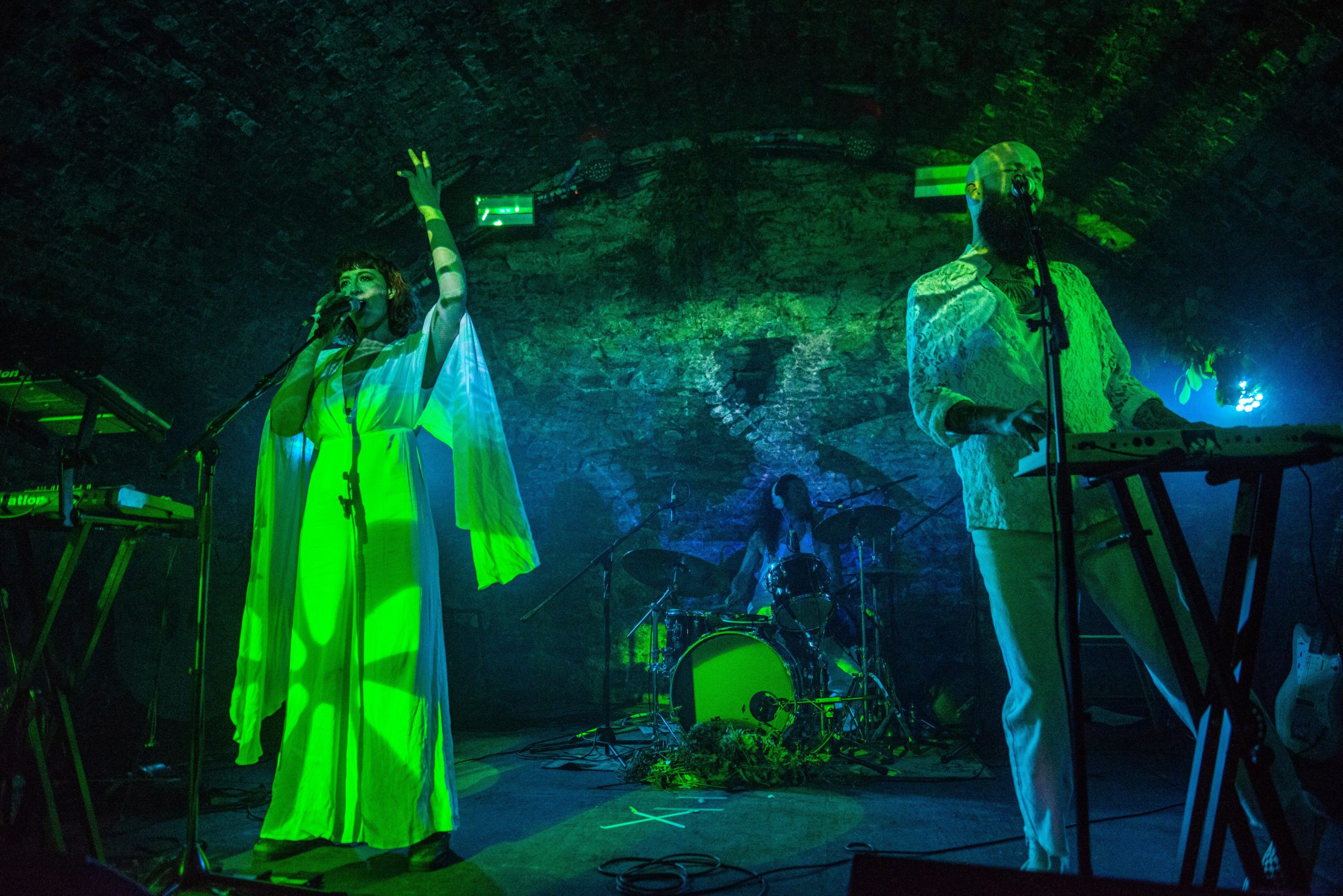Emily beams, repeatedly asking us if we’re ready to dance. She slinks across the stage, a nymph of the Loco Klub forest, her long chiffon sleeves following her. It’s the first time I’ve seen someone play an electronic ukulele, and each pluck casts warmth between the cold arched walls. But this isn’t a tired ‘Riptide’ kind of ukulele: it refreshingly intertwines with brooding synths. The band have perfected the art of playing songs with pauses in just the right places, leaving us hanging on every word.