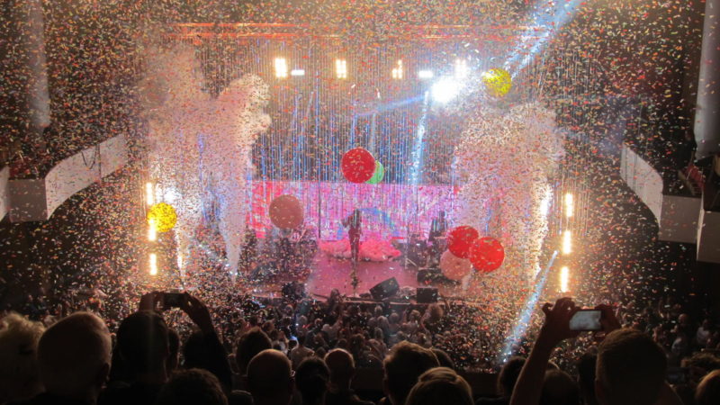 Tousle-haired, eye-patched captain of chaos, frontman Wayne Coyne, takes the stage with his starship troopers to a massive ovation and remarks, “People think we’re trying to escape America, hoping that Trump will be killed by the time we get back.” With that cheerful thought in mind, Race For The Prize gets underway. A galaxy of ticker tape, blinding strobes and huge balloons sweep along with synthesised orchestral aplomb filling every corner of the venue.