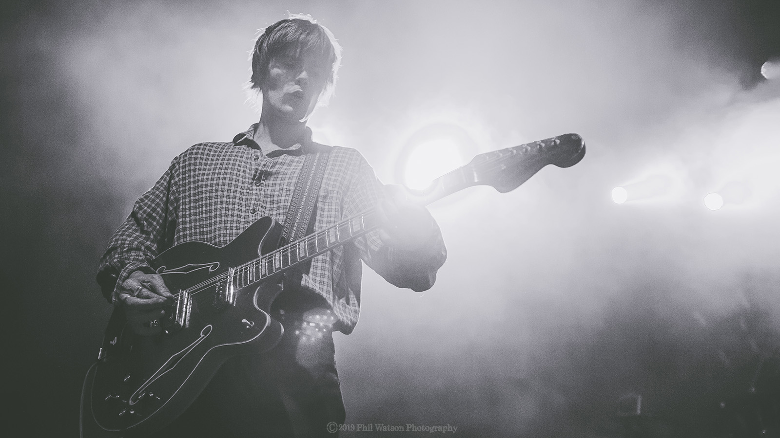 Grian Chatten was a tight fist of barely supressed energy, pacing centre stage relentlessly, right arm flailing as he sang-spoke the lyrics, commanding the words. His on-stage demeanour is totally the opposite of typical front men and especially many of his (so called) punk revival contemporaries. Taking a less is more approach in terms of audience engagement (closer to nothing is more actually) there was no engagement with the crowd until at least three quarters of the set had powered by. But that mattered not one single bit – the music and the words spoke for themselves, and why bother when the band had the crowd in their hand simply by playing a blinder?