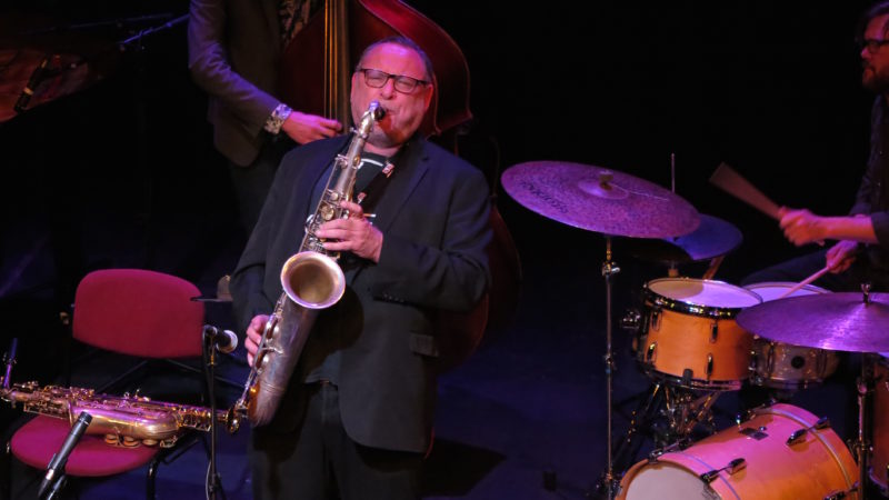 It didn’t take long for an amazing unity to develop, no doubt helped by ‘standard’ tunes like In A Sentimental Mood, A Moment’s Notice, Old Folks and Beautiful Dreamer but mostly achieved by the confident improvisational skills of the four players. It was soon evident how much Gilad appreciated this, often challenging one player or other in a fiery face-off, urging thunderous duets with Dave Smith, lyrical counterpoint with Will’s bass or some exceptionally clever and playful collaborations with the pianist. One such figured in My One and Only Love, with Gilad’s lyrical soprano sax intricately interlaced with Jim’s melodic and rhythmic inventions. The music was reformed and remoulded in their hands in a stream of consciousness that was almost revelatory.