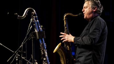 It didn’t take long for an amazing unity to develop, no doubt helped by ‘standard’ tunes like In A Sentimental Mood, A Moment’s Notice, Old Folks and Beautiful Dreamer but mostly achieved by the confident improvisational skills of the four players. It was soon evident how much Gilad appreciated this, often challenging one player or other in a fiery face-off, urging thunderous duets with Dave Smith, lyrical counterpoint with Will’s bass or some exceptionally clever and playful collaborations with the pianist. One such figured in My One and Only Love, with Gilad’s lyrical soprano sax intricately interlaced with Jim’s melodic and rhythmic inventions. The music was reformed and remoulded in their hands in a stream of consciousness that was almost revelatory.