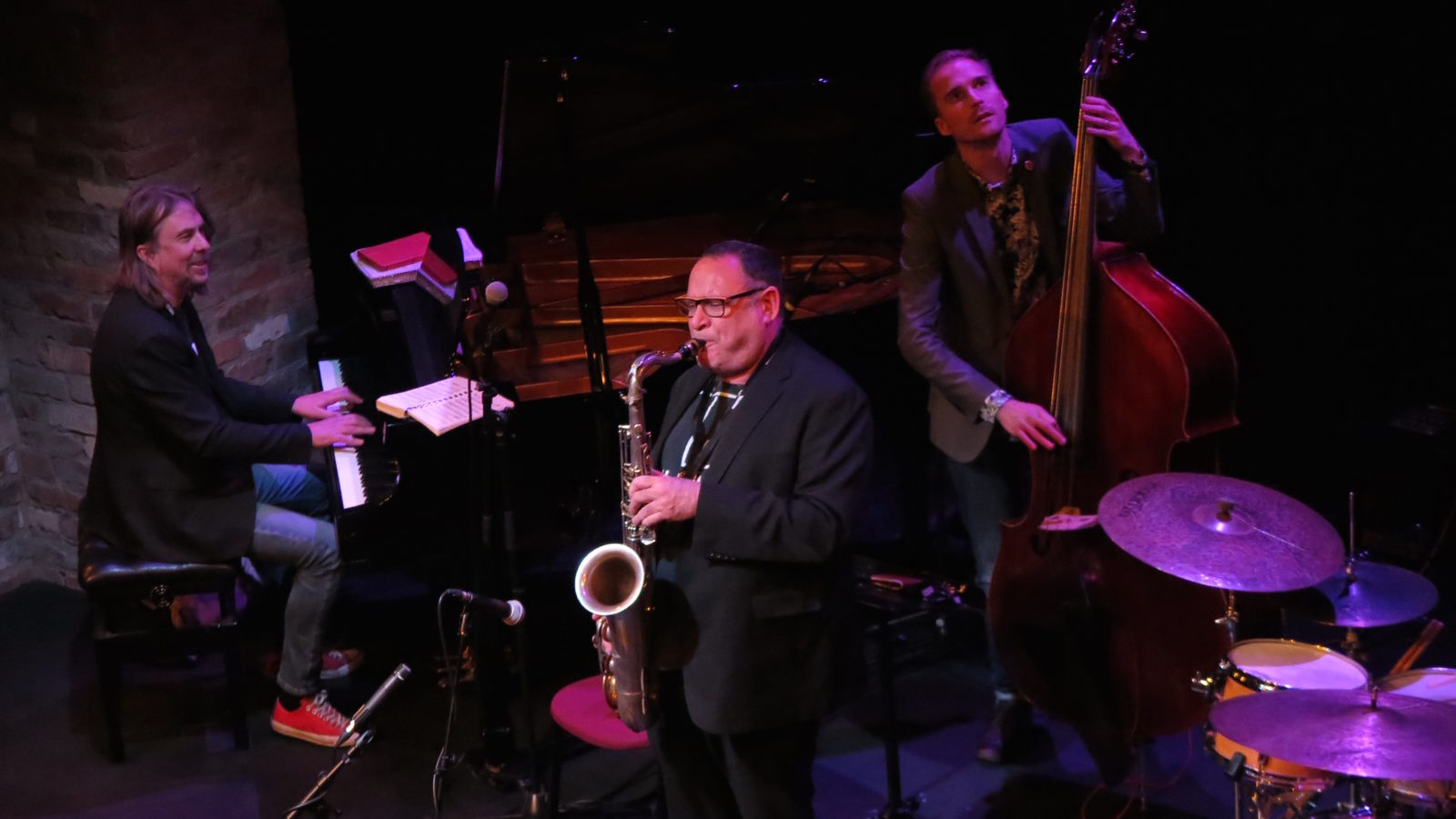 Looking round at the Old Vic’s new Weston Studio, with the classic grand piano, double bass and drums set up facing the horseshoe of seating, it certainly felt right for jazz. It was something about the rough-hewn brickwork and girders and the fact that it was physically underground, perhaps. But far from shabby, too, and – as it proved – pretty good acoustically (something powerhouse saxophonist Gilad Atzmon was obviously determined to test).