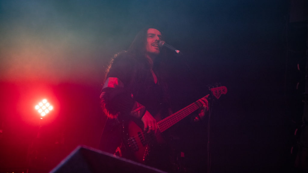 Now it’s inflatable hammers aloft as a huge cheer goes up to greet Angus McFife XIII, Crown Prince of Fife, as he bounds on in a flowing cape, wielding his trusty hammer. Fact fans may wish to note that this goblin-vanquishing pretend Scotsman is actually Swiss, his real name is Thomas Laszlo Winkler, and he’s a notary public who runs his own law firm. I am seriously not making any of this shit up. But he obviously gets out of the office enough to hone his craft as a commanding frontman with a commendably straight face, unfazed by Gloryhammer’s booming popularity (their previous Bristol gig was at the Fleece back in 2013).