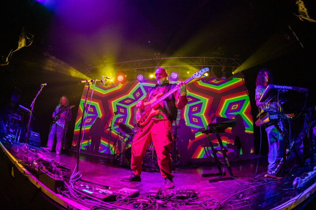 Turns out he’s Vinny Shillito, who’s played with the Ozrics on and off since the 1990s. His hard-driving, gut-punching bass sound certainly helps to kick the rhythms of this venerable progressive instrumental cosmic hippy dance music up a notch.