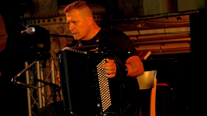 Seated behind his large button accordion Bosnian musician Mario Batkovic looked a solitary figure until he began to play. Then the combination of his ebullient showmanship and emphatic, driving original music expanded to fill the church to crowd-pleasing effect. His trademark sound generally layered dazzlingly fast arpeggios a la Philip Glass with cross-rhythmic left hand work and sudden thunderous bass riffs.