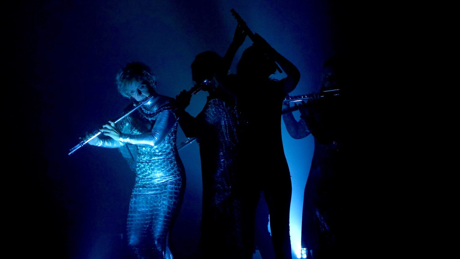 Sandwiched between Anna Phoebe and Arushi Jain, however, was the truly strange Icelandic act viibra, six flute players clad in a variety of shiny fish-like costumes. They emerged through the darkness into a foggy backlit gloom to play original music that layered disharmonies and drones in a minimalist tumult with occasional flashes of melodic form. Their choreographed performance saw them writhe and drift, shifting their formations with calculated grace, maybe mermaids, maybe Rhinemaidens.