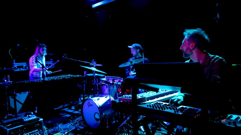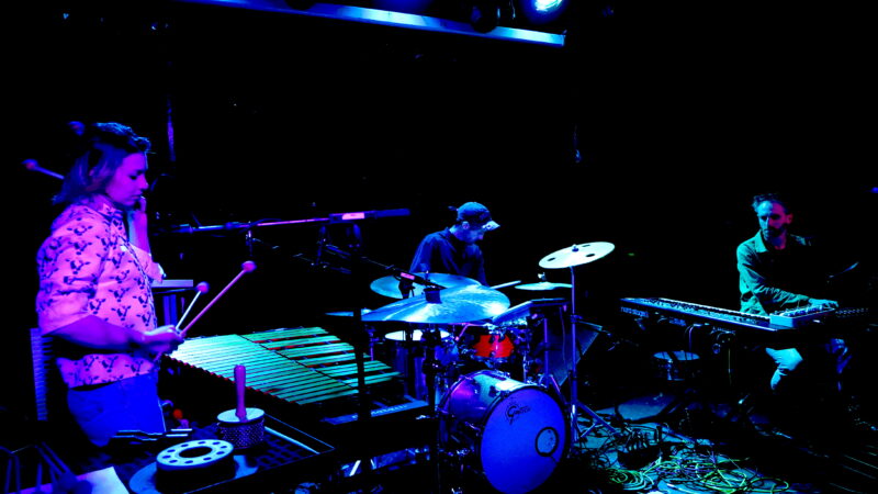 The evening was a celebration of Hippo’s latest album release New Normal but before we got to hear that there was Zoobers. Drummer Chris Langton was sandwiched between Dorian Childs-Prophet’s banks of keyboards on one side and Harriet Riley’s marimba and percussion on the other. Chris (literally) kicked things off with a snappy four-to-the-floor house beat soon washed over with massive sweeps of lush synth, Harriet’s dancing marimba riffs and a gravelling Moog bass undertow. It was instant impact stuff, as if Milt Jackson had taken a holiday in 90s Ibiza, quickly followed by some 606-style block rocking over broken beats drumming and looping marimba minimalism.