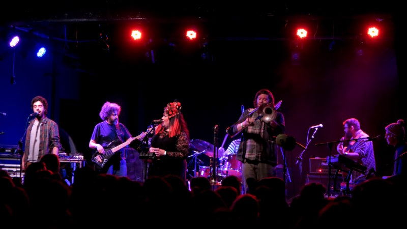 The obvious thing to notice about Honeyfeet is front woman Rioghnach Connolly’s fiercely diminutive figure, for this night topped with what looked like a Japanese Kabuki headdress and brandishing her trademark wooden Irish flute. If you’re not careful that could be the only thing you notice: as well as possessing a voice that combines fine modulated tones with raw power the singer has the kind of commanding presence that draws you in and holds your attention unwaveringly. Tear your eyes away, however, and you immediately notice that the other six members of the band constitute a rock-solid rhythm section capable of moving from sleazy swamp blues to jaunty folk-pop or stadium funk without missing a (heart)beat.