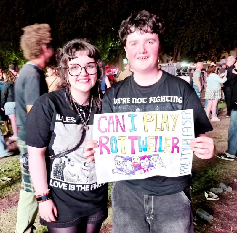 Talbot spots a young fan with a tiny sign saying ‘Can I play Rottweiler?’ Straight away Aiden is told to get on stage, and he’s on. What a dream! He killed it on a guitar right up in the mix.